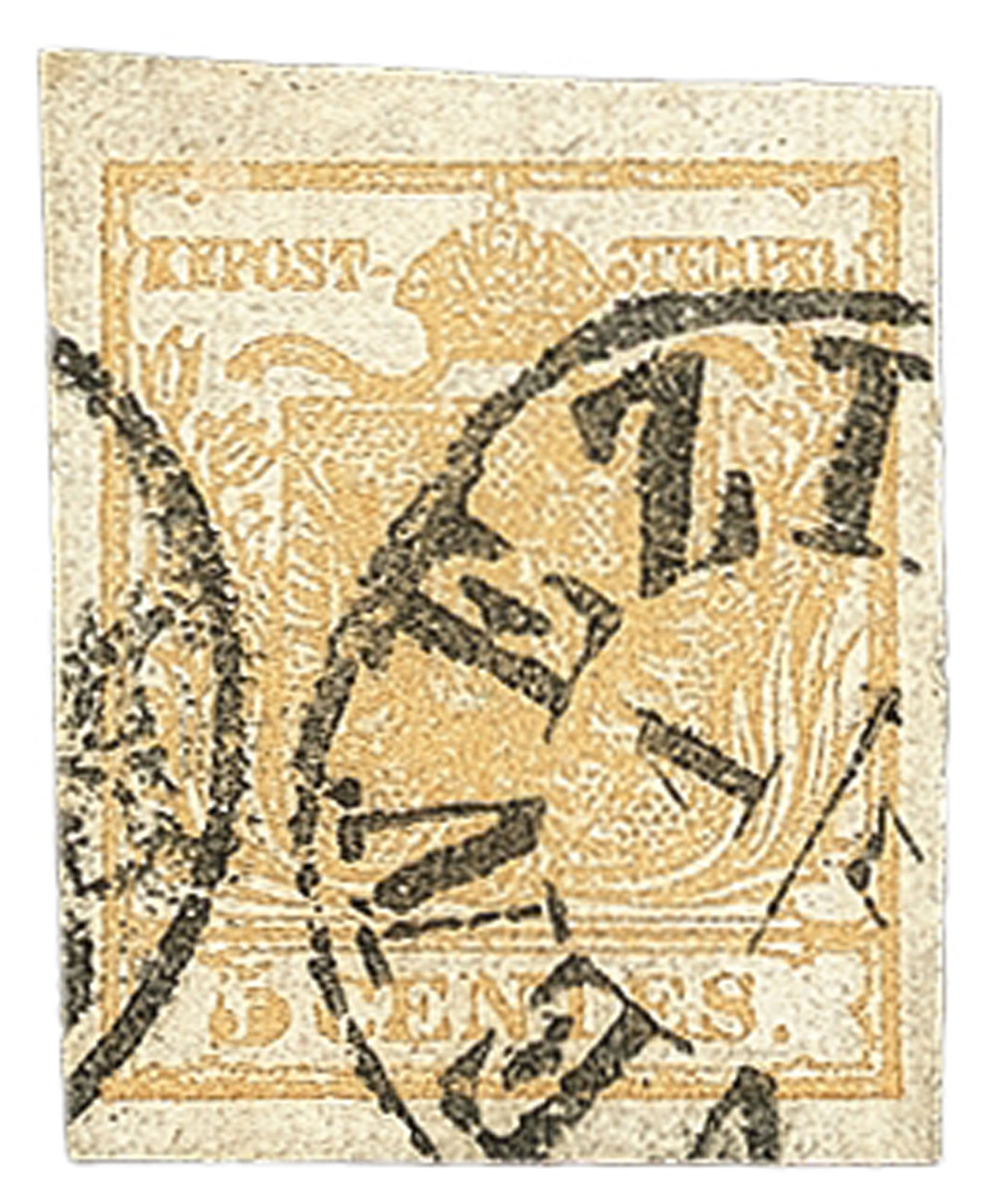 5 cent giallo ocra con controstampa diritta (13A cat. 3.250) usato - ottimi margini - cert. Colla