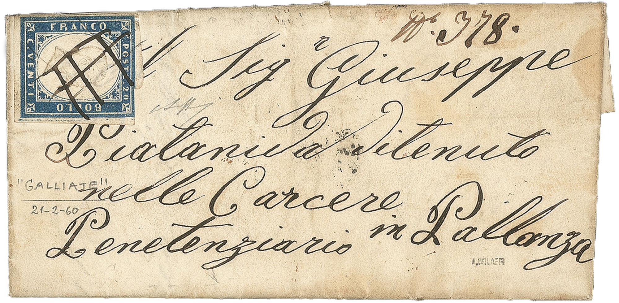 Letterina affrancata con 20 cent (15Ca) annullato con tratti a penna di Galliate del 21.2.1860 per Pallanza - unica nota - firme G. Bolaffi + A. Bolaffi