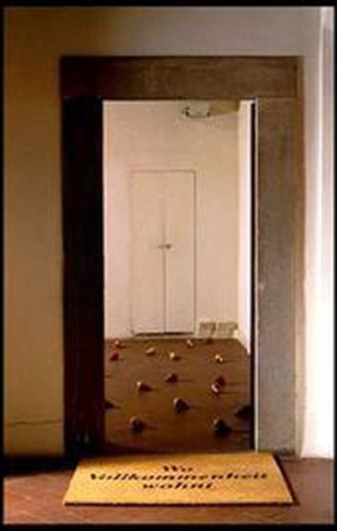 Installazione composta da 36 pere di plastica e serigrafia su zerbino, esemplare unico