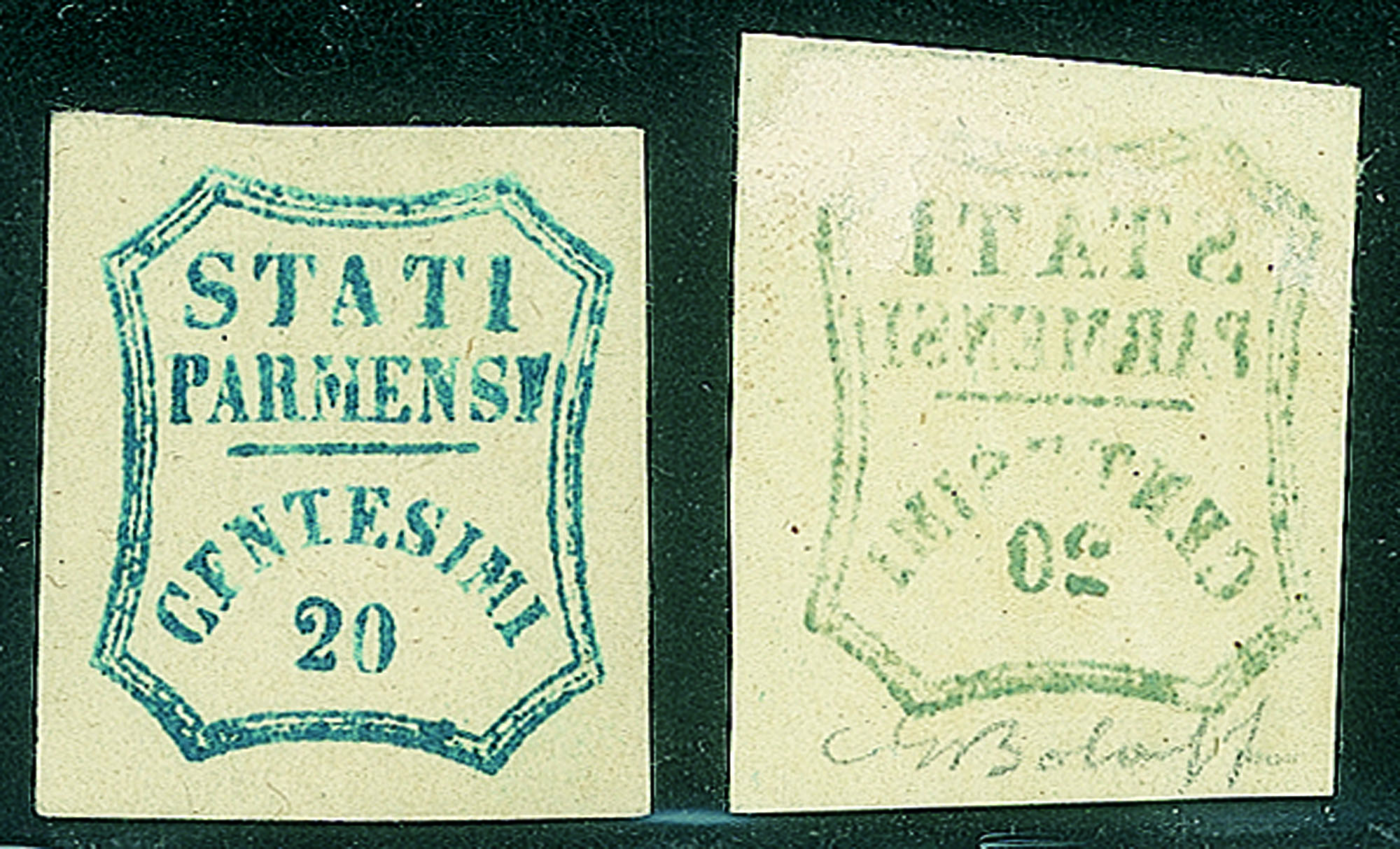 Difetto di clichè nella I di Parmensi, firma G.Bolaffi, unito altro esemplare con decalco, ma con leggero assottigliamento