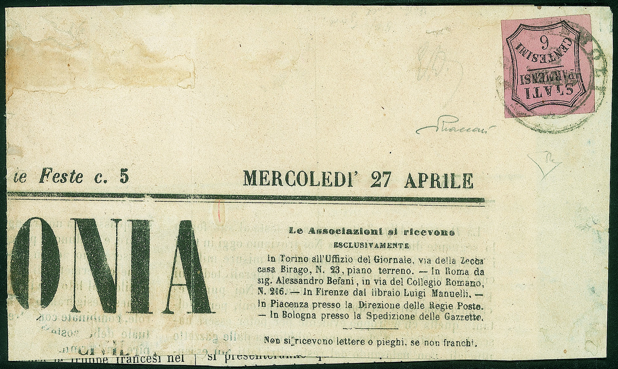 Antichi Stati Italiani - Parma - Testata di Giornale L'ARMONIA affrancato con segnatasse c.6 rosa