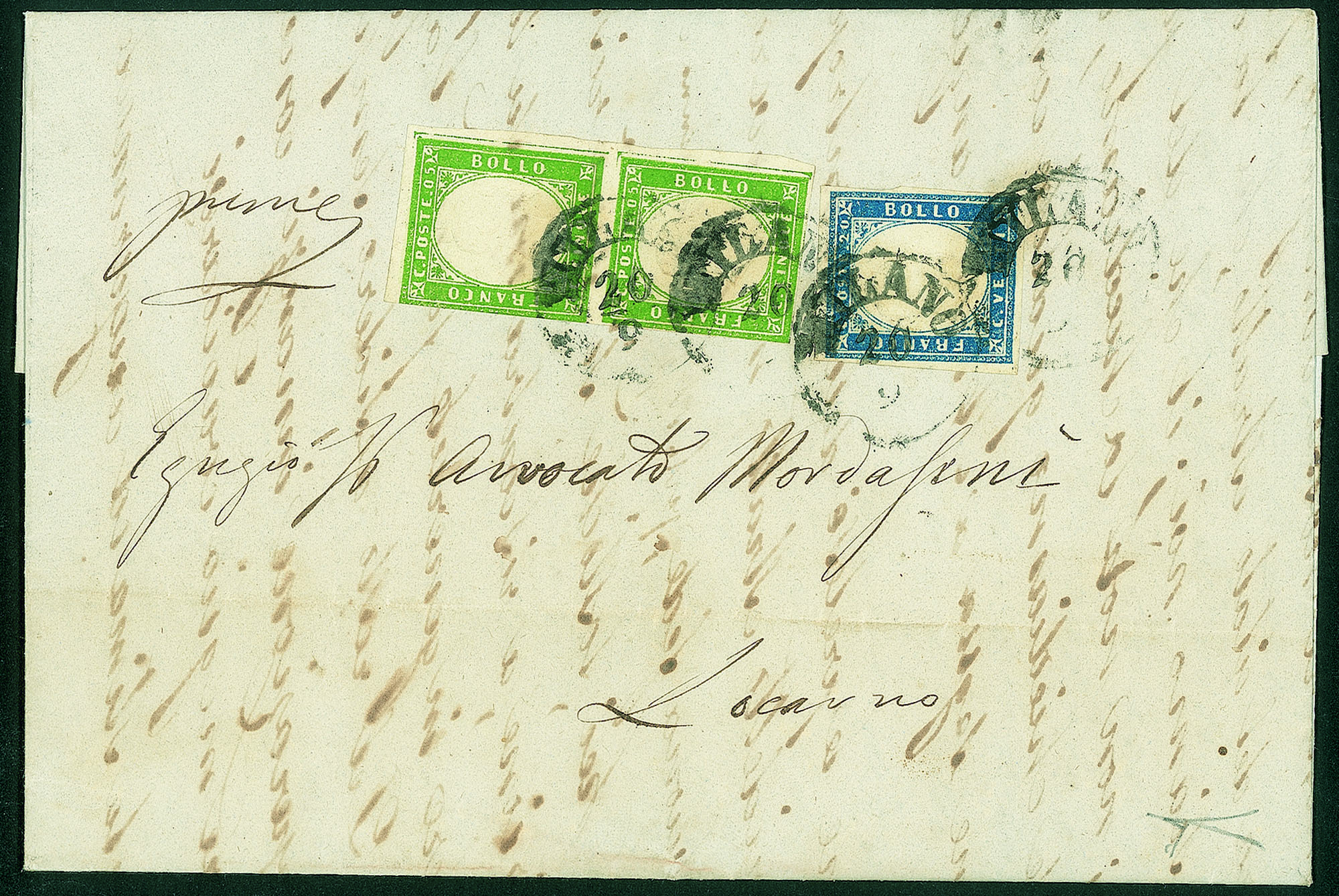 Antichi Stati Italiani - Lombardo Veneto - Lettera per la Svizzera affrancata con Sardegna coppia verticale c.5 verde giallo + c.20 azzurro scuro (13Ba+15B)