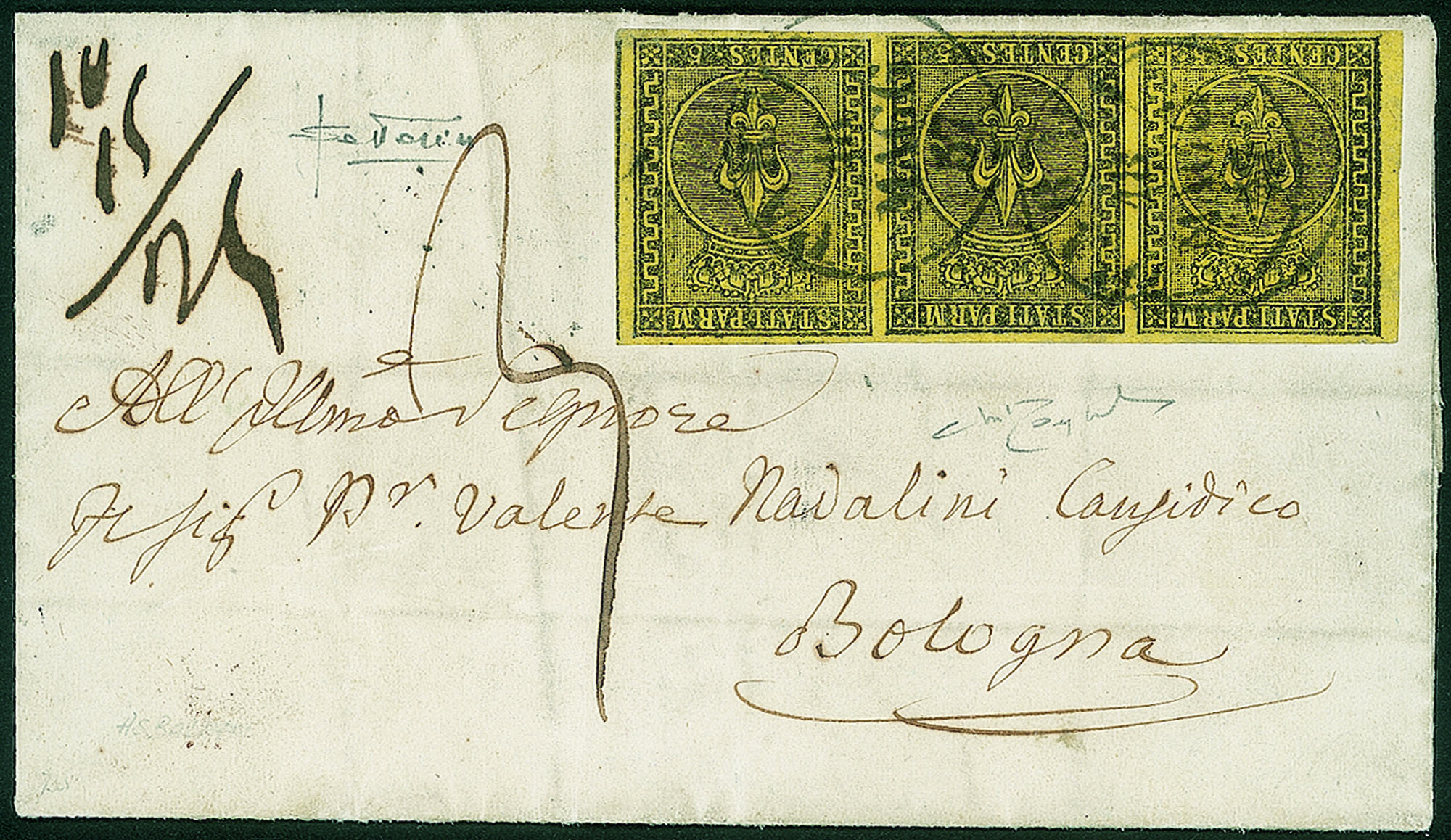 Antichi Stati Italiani - Parma - Lettera con striscia di tre c.5 giallo arancio