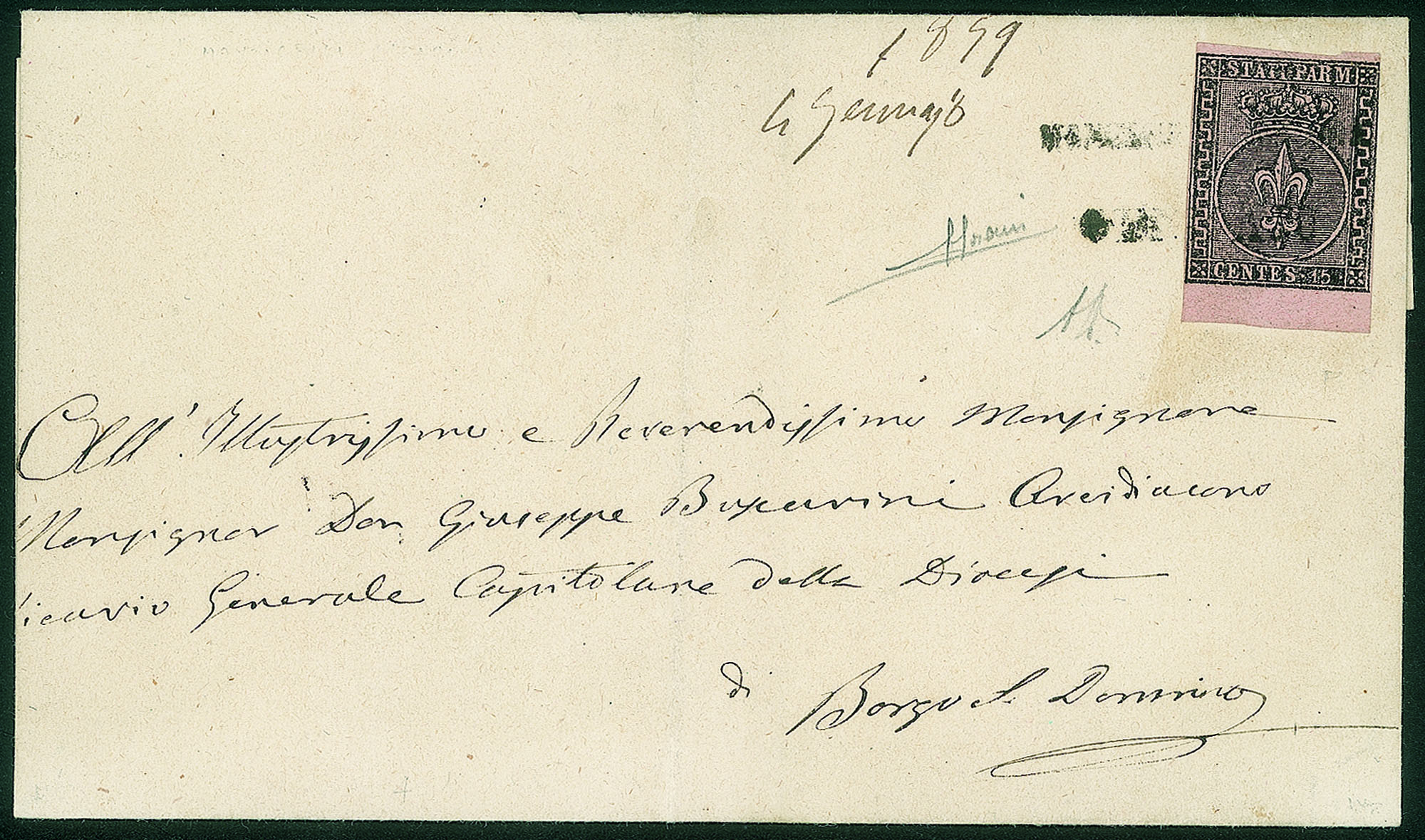 Con annullo lineare su tre righe MONTICELLI D'ONGINA 4 GENNAIO del 1859 per Borgo San Donnino (P.ti 8)
