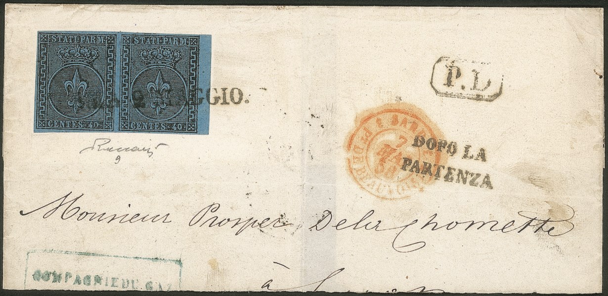 Bordo di foglio, da PARMA 2 MAGGIO del 1856 con a lato i bolli P.D in cartella e lineare su du righe DOPO LA PARTENZA