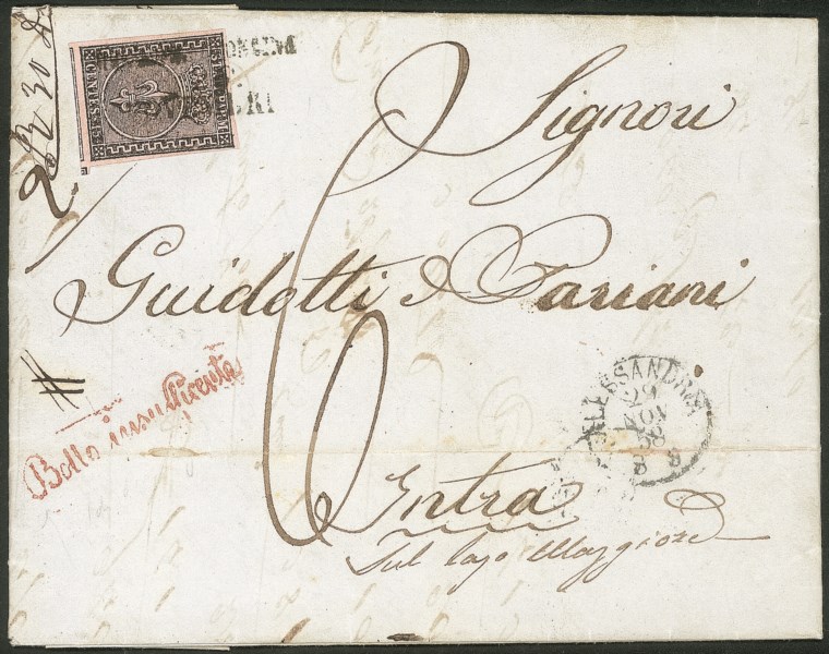 Da MONTICELLI D'ONGINA 27 NOVEMBRE del 1858 per Intra con a lato il bollo in corsivo rosso Bollo insufficiente e segno di tassa 6 decimi per il doppio porto, rara