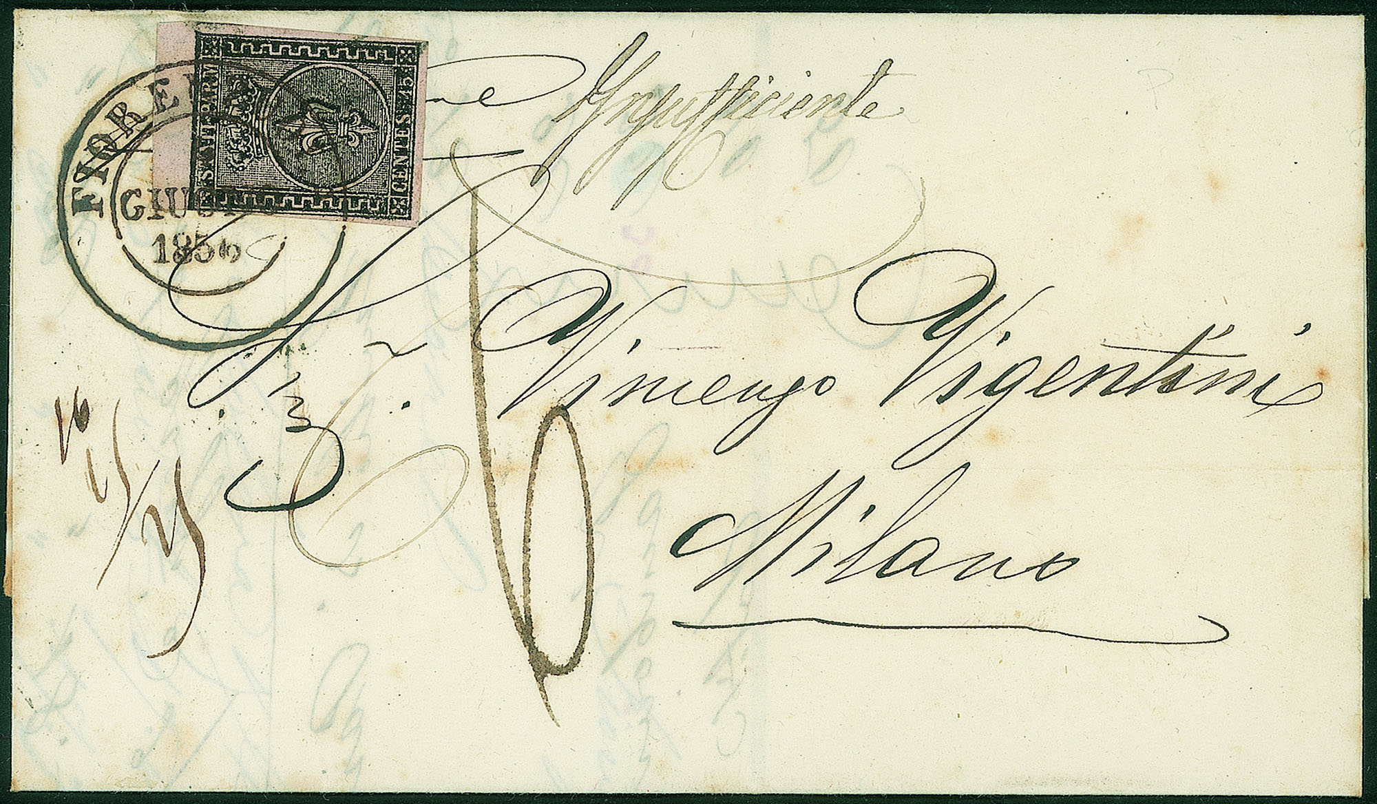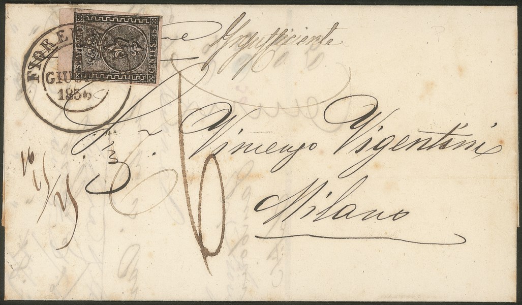 Bordo di foglio in alto, annullato con d.c. FIORENZUOLA 4 GIUGNO 1856 per Milano, a lato manoscritto Insufficiente e segno di tassa 6 con dettaglio della tassazione