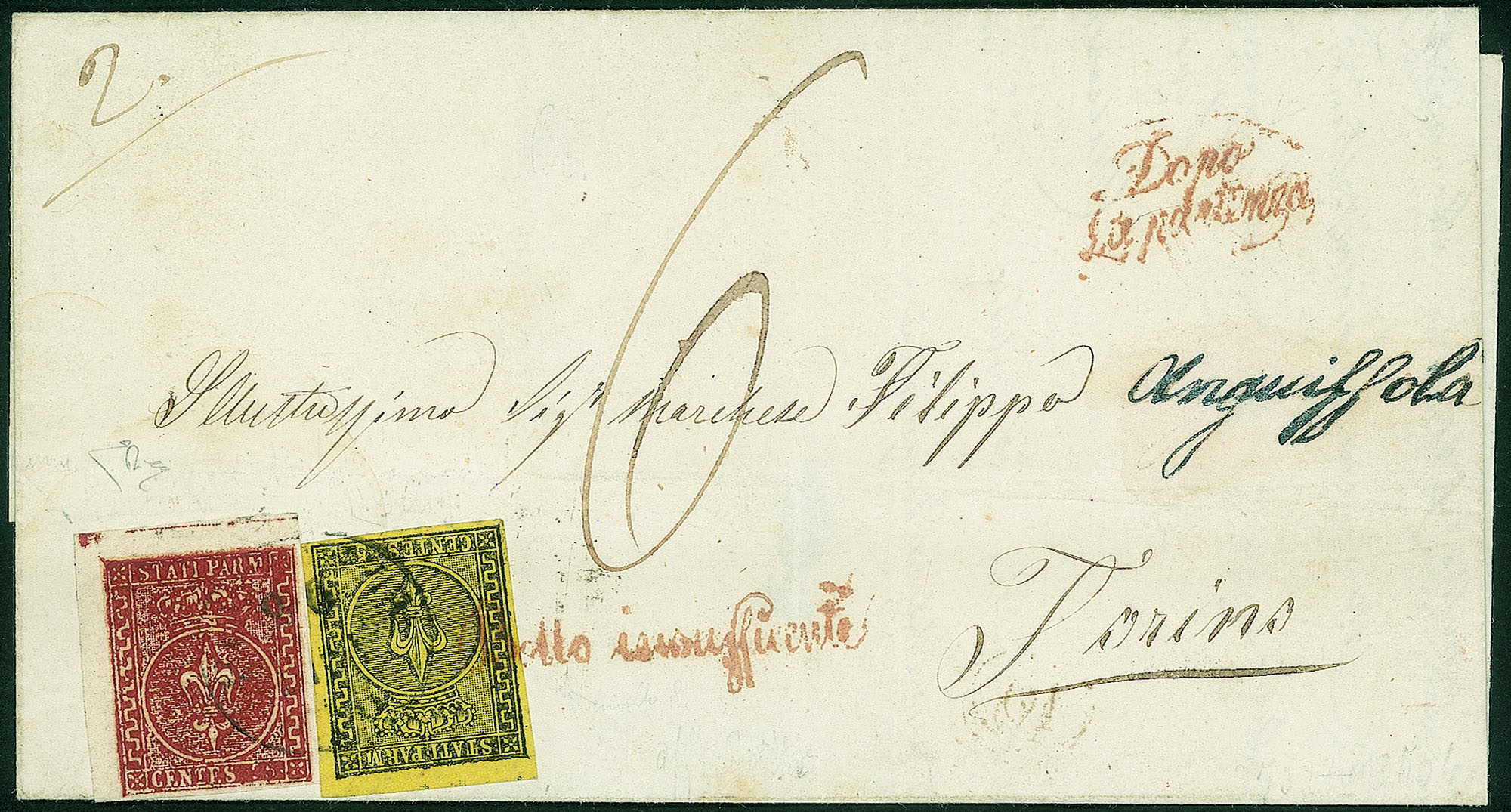 Antichi Stati Italiani - Parma - Lettera doppio porto con c.5 giallo prima emissione + c.25 bruno rosso