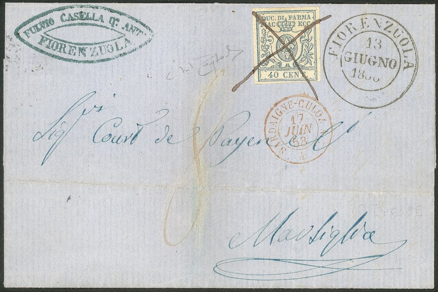 Antichi Stati Italiani - Parma - Lettera per la Francia con c.40 azzurro terza emissione