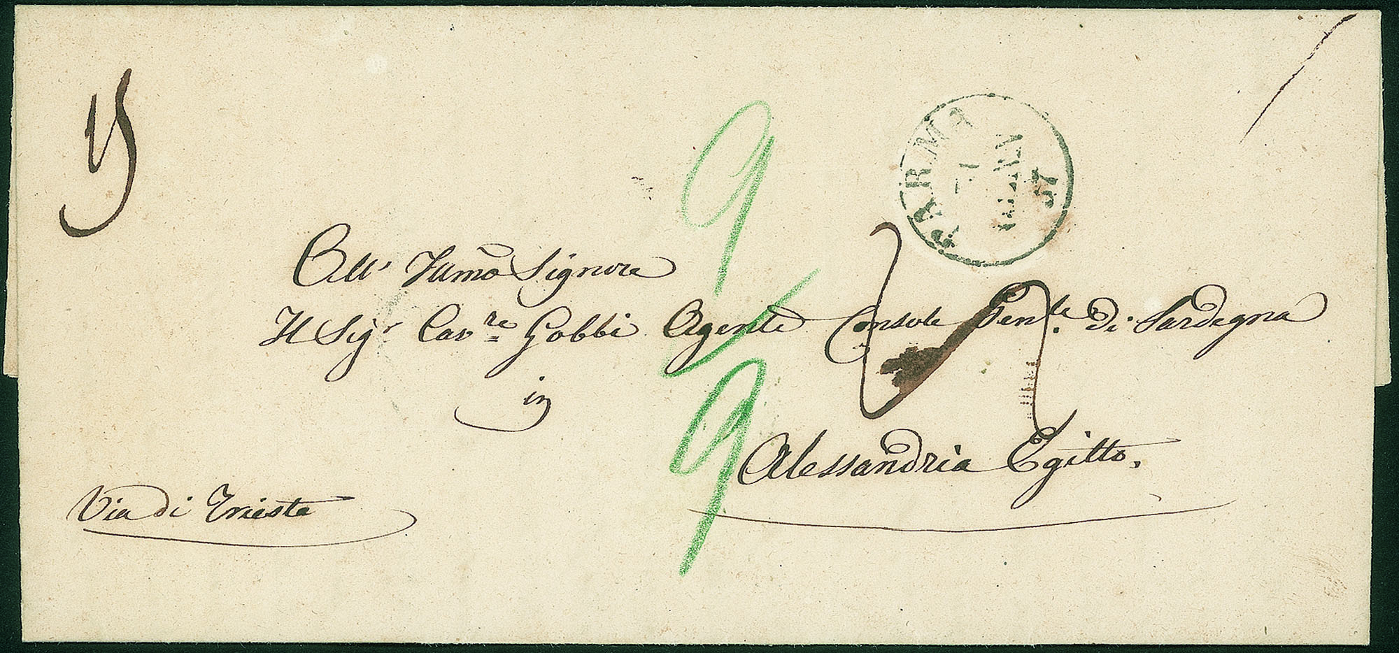 Da PARMA 31 GENN.57 diretta al console Sardo via Trieste con tassa 9/9 kreuzer (9 kr. Pfino a Trieste e 9 kr. A favore dei Lloyd.