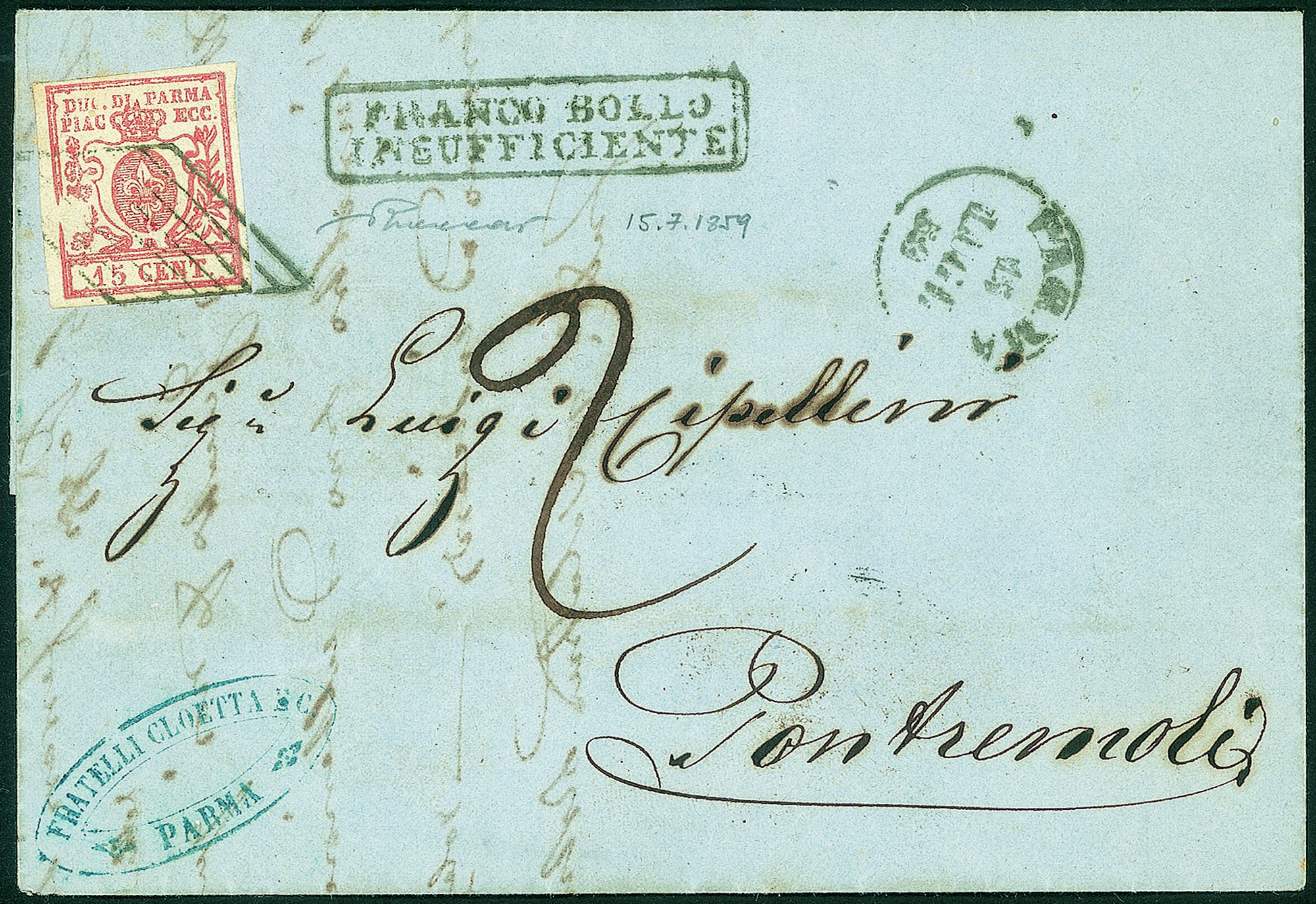 Antichi Stati Italiani - Parma - Lettera con c.15 vermiglio annullo a losanga di PARMA 15 LUG.59