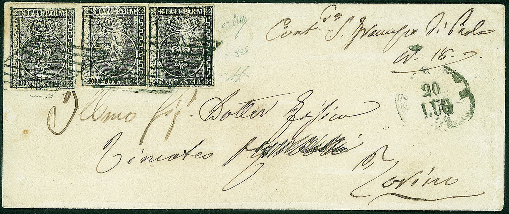 Da PIACENZA 20 LUG.59 per Torino, in eccesso di 10 centesimi in quanto affrancata con la vecchia tariffa ducale, mentre erano ormai in corso le tariffe sarde per le quali bastavano 20 centesimi per qualunque distanza