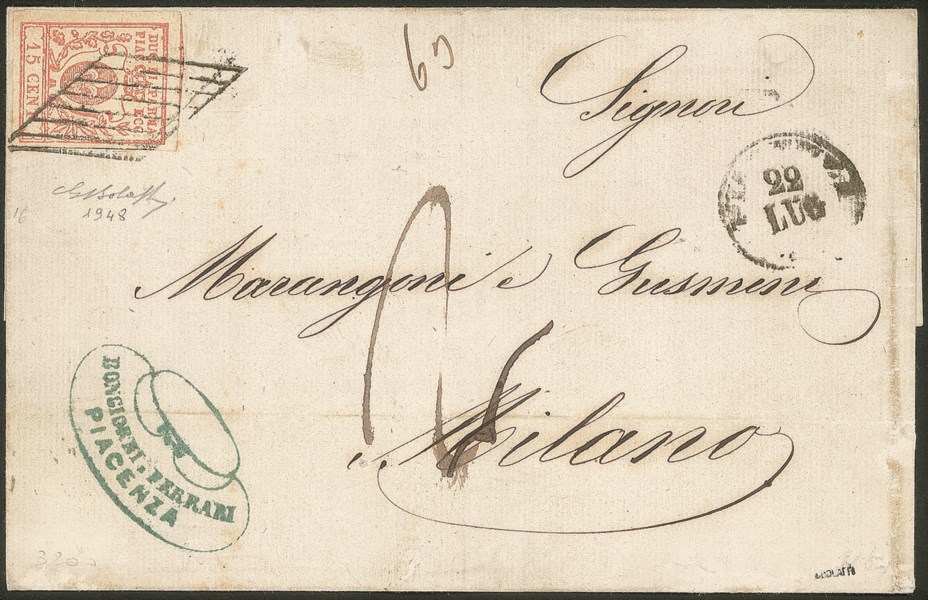Antichi Stati Italiani - Parma - Lettera con c.15 vermiglio annullo a losanga di PIACENZA 22 LUG.59