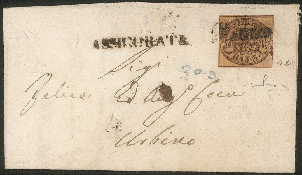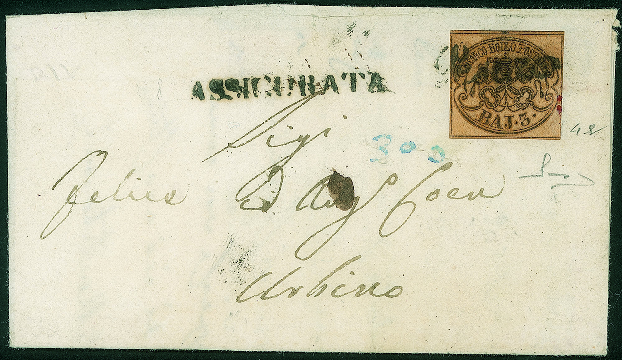 Antichi Stati Italiani - Stato Pontificio - Raccomandata da Pesaro (cors.) a Urbino con 3 baj bistro arancio