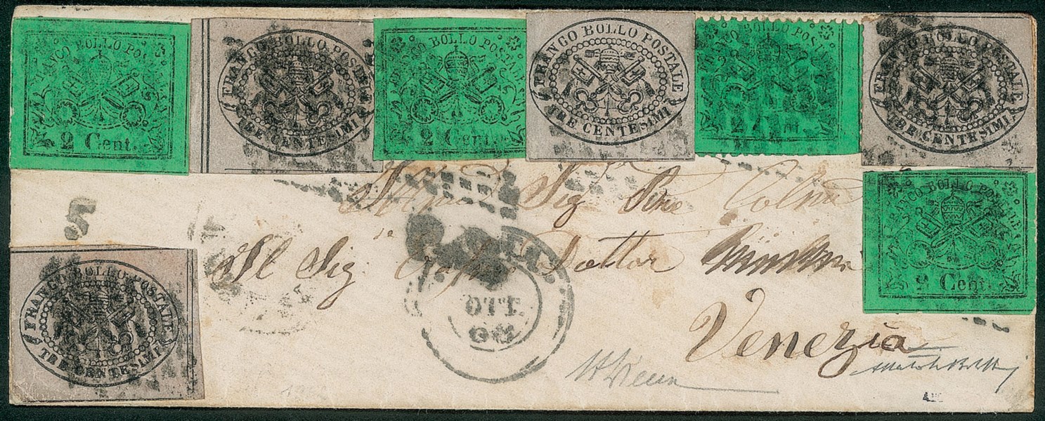 3 esemplari del 2 cent verde giallastro scuro (17) + un 2 cent verde giallastro dentellato (25) + 4 esemplari del 3 cent grigio rosa (18) da Roma a Venezia del 3 ottobre 1868 - grande rarità qualità Bolaffi ad Honorem - cert. A. Diena + cert. Bolaffi