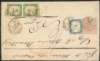 Viaggiata coi Piroscafi Postali Francesi in tariffa da 70 centesimi per Napoli e affrancata con seconda emissione c.40 rosa+ IV emissione c.20 cobalto + coppia c.5 verde giallo (6a+ 13a + 15) da ALESSANDRIA 11 GEN.56, nonostante i difetti insieme molto raro e fresco, cert. G.Bottacchi