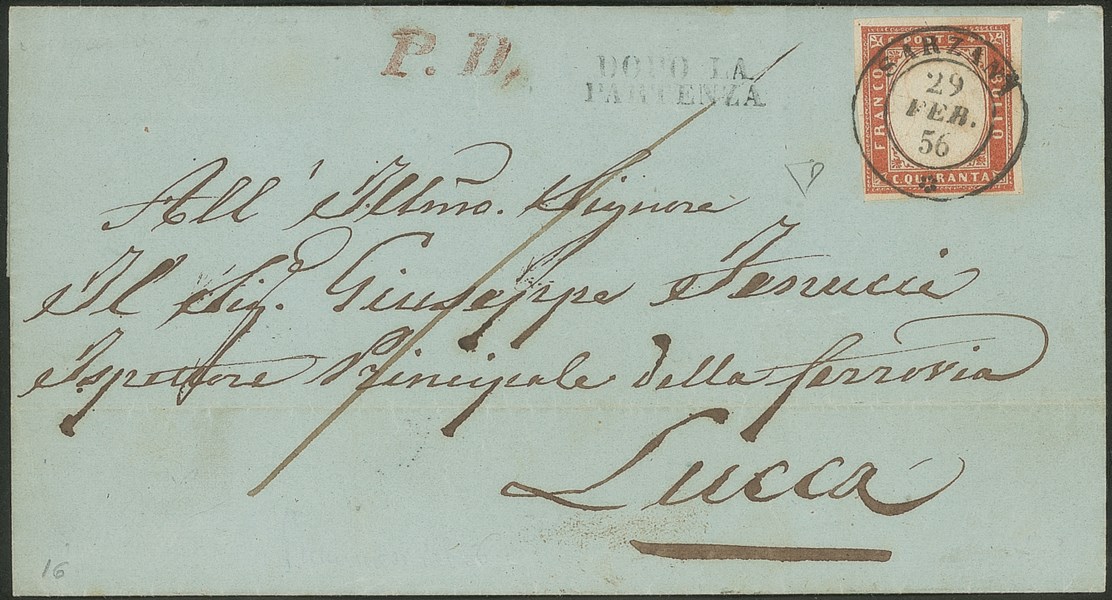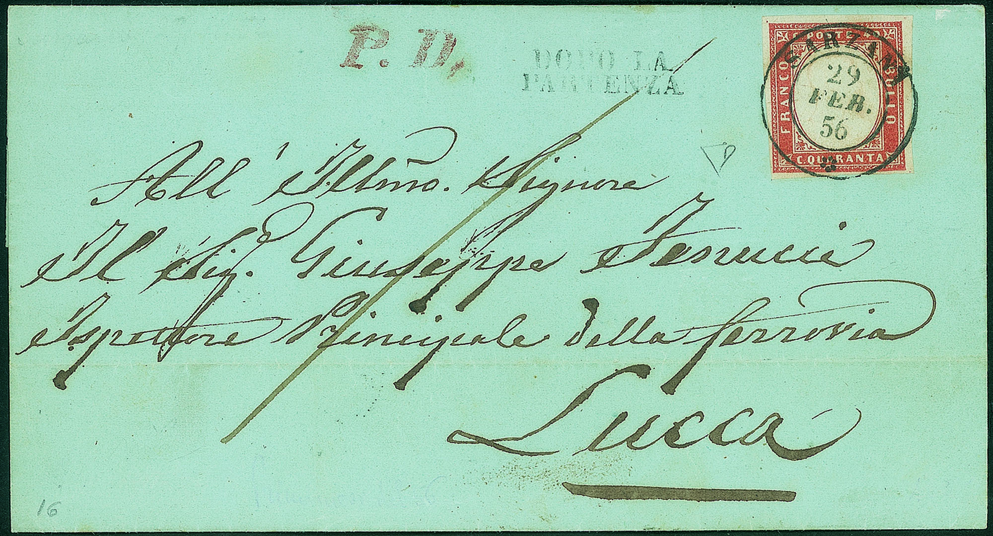 Per Lucca con a lato il bollo P.D. in rosso + lineare DOPO LA PARTENZA, cert. E.Diena