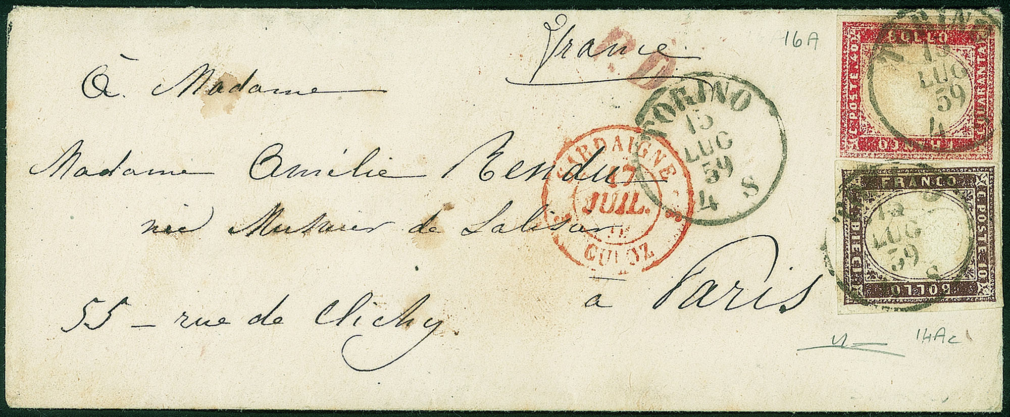 Antichi Stati Italiani - Sardegna - Bustina affrancata con 10 cent bruno porpora (14Ac) + 40 cent rosso scarlatto (16A)