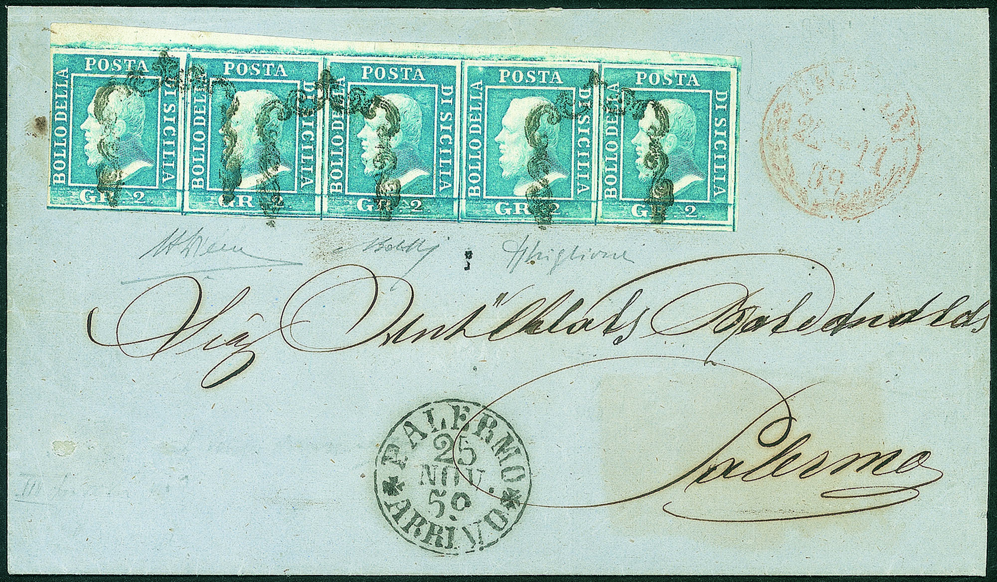 Antichi Stati Italiani - Sicilia - Lettera eccezionale con striscia orizzontale di cinque del gr.2 azzurro