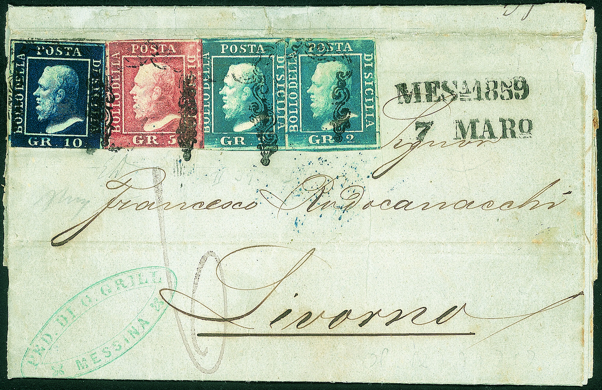 Composta da due esemplari del 2grana cobalto I tavola carta di Napoli + 5 grana rosa carminio I tavola + 10 grana azzurro cupo (6b + 9 + 12) da Messina 7 MAR del 1859 per Livorno - cert. Bottacchi