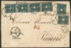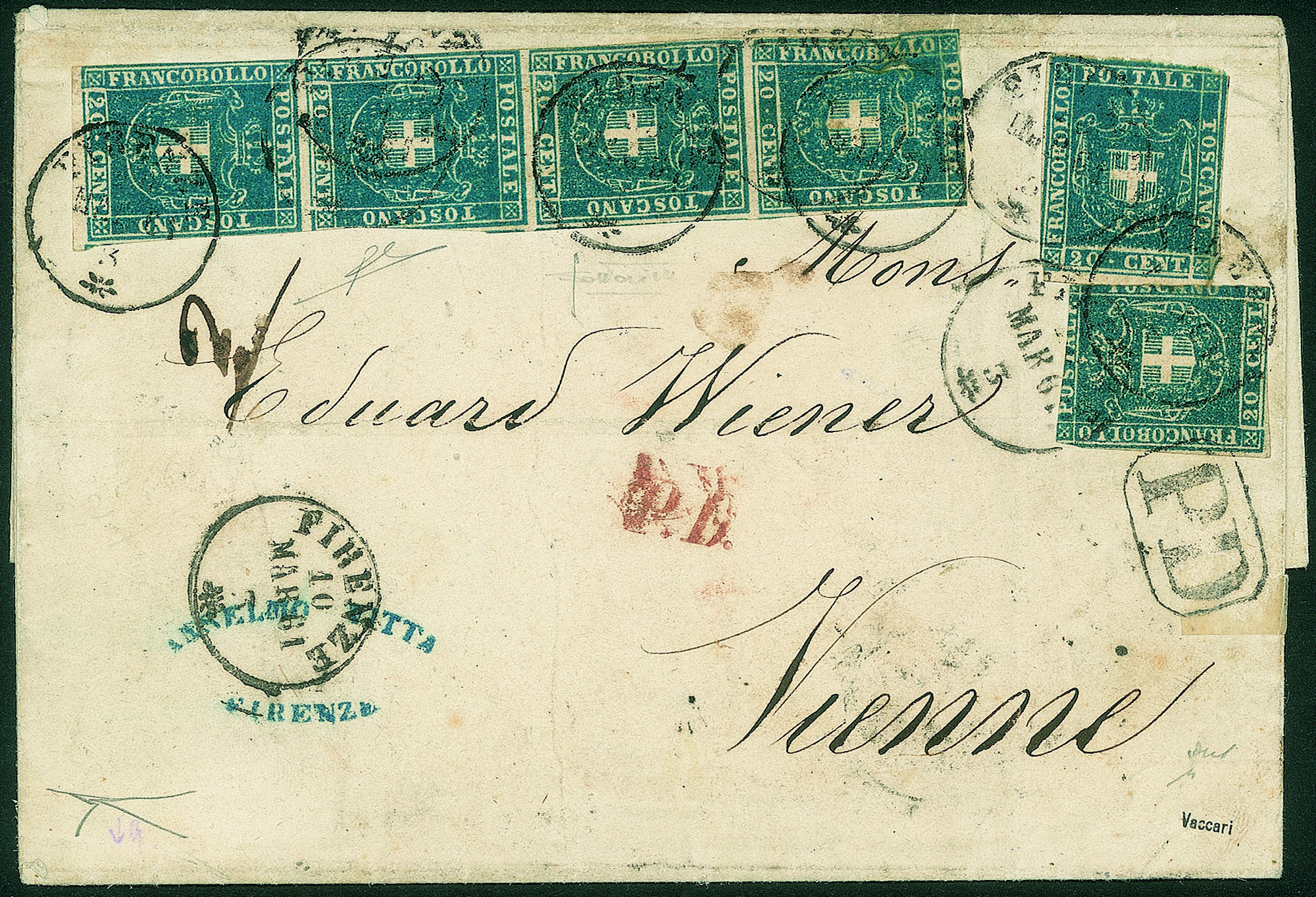 Antichi Stati Italiani - Toscana - 1860 Eccezionale lettera con striscia verticale di quattro + due esemplari del c.20 azzurro