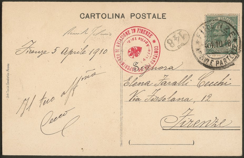 Con annullo rosso COMITATO PER UN ESPERIMENTO DI AVIAZIONE DI FIRENZE (Longhi 232) - Firenze 5.4.10 - cert. Fabris