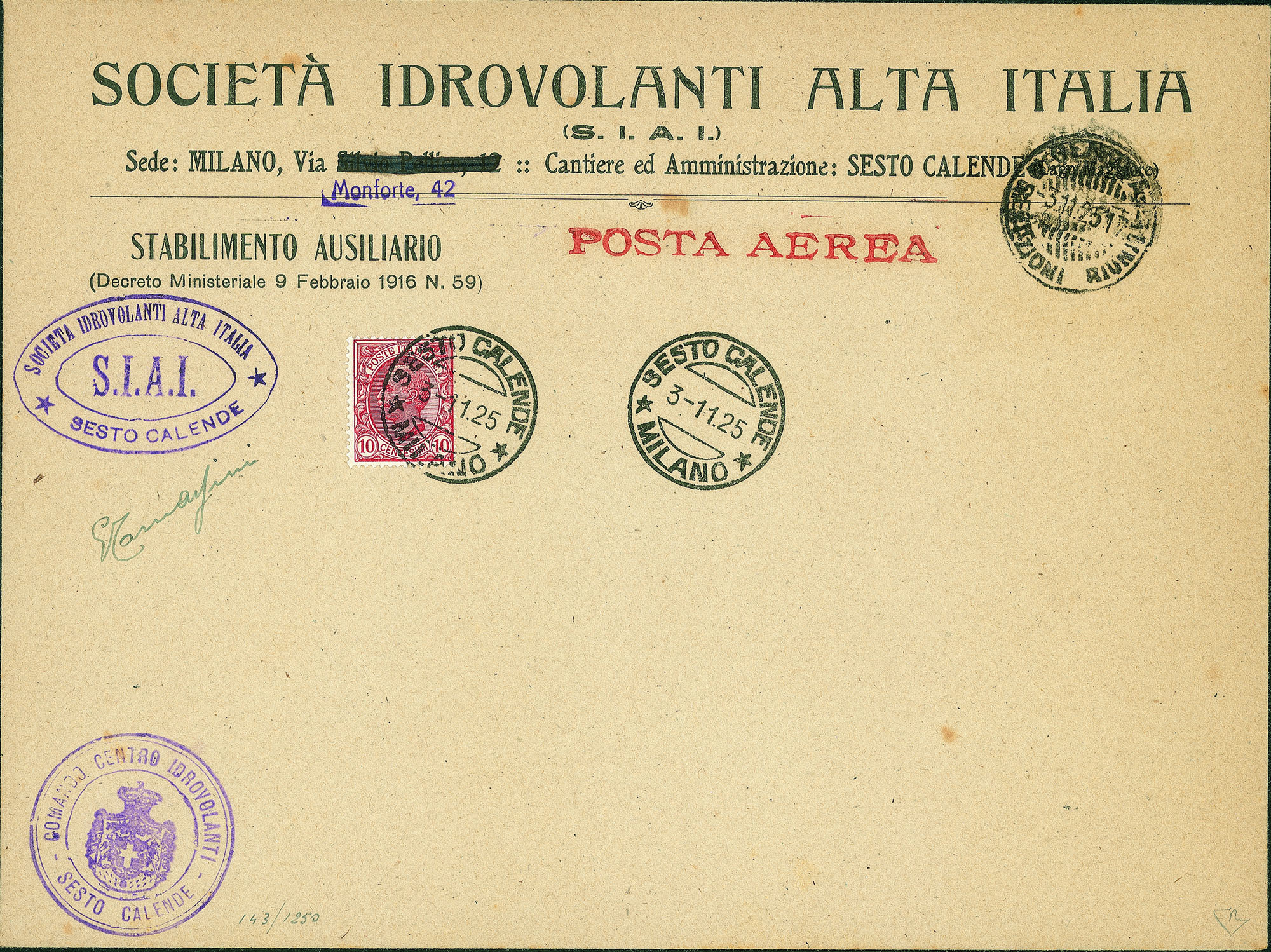 Per la prima tappa del Volo con timbro violetto Società Idrovolanti Alta Italia + Comando Centro Idrovolanti - dispaccio composto da 53 buste - cert. Diena
