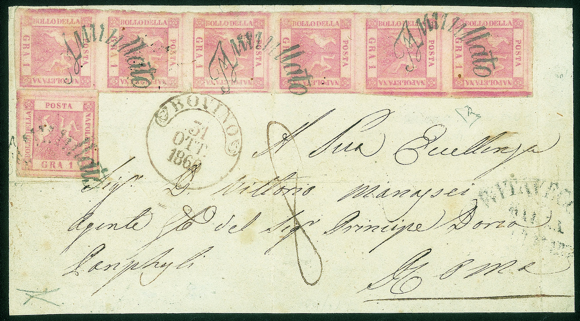 Antichi Stati Italiani - Napoli - Lettera affrancata con striscia verticale di sei + singolo del gr.1 rosa carminio