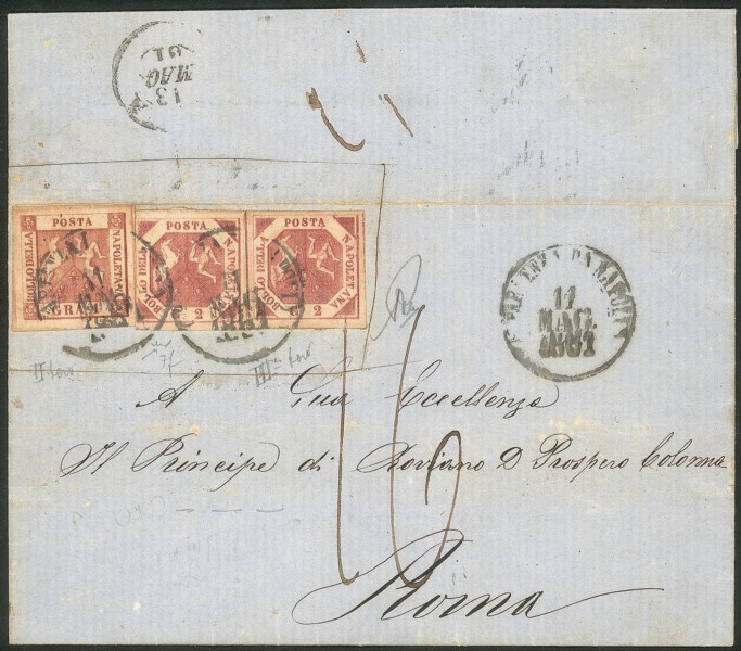 Antichi Stati Italiani - Napoli - Uso tardivo - Lettera affrancata con esemplare del 1 grana più coppia del 2 grana (4a+7f)