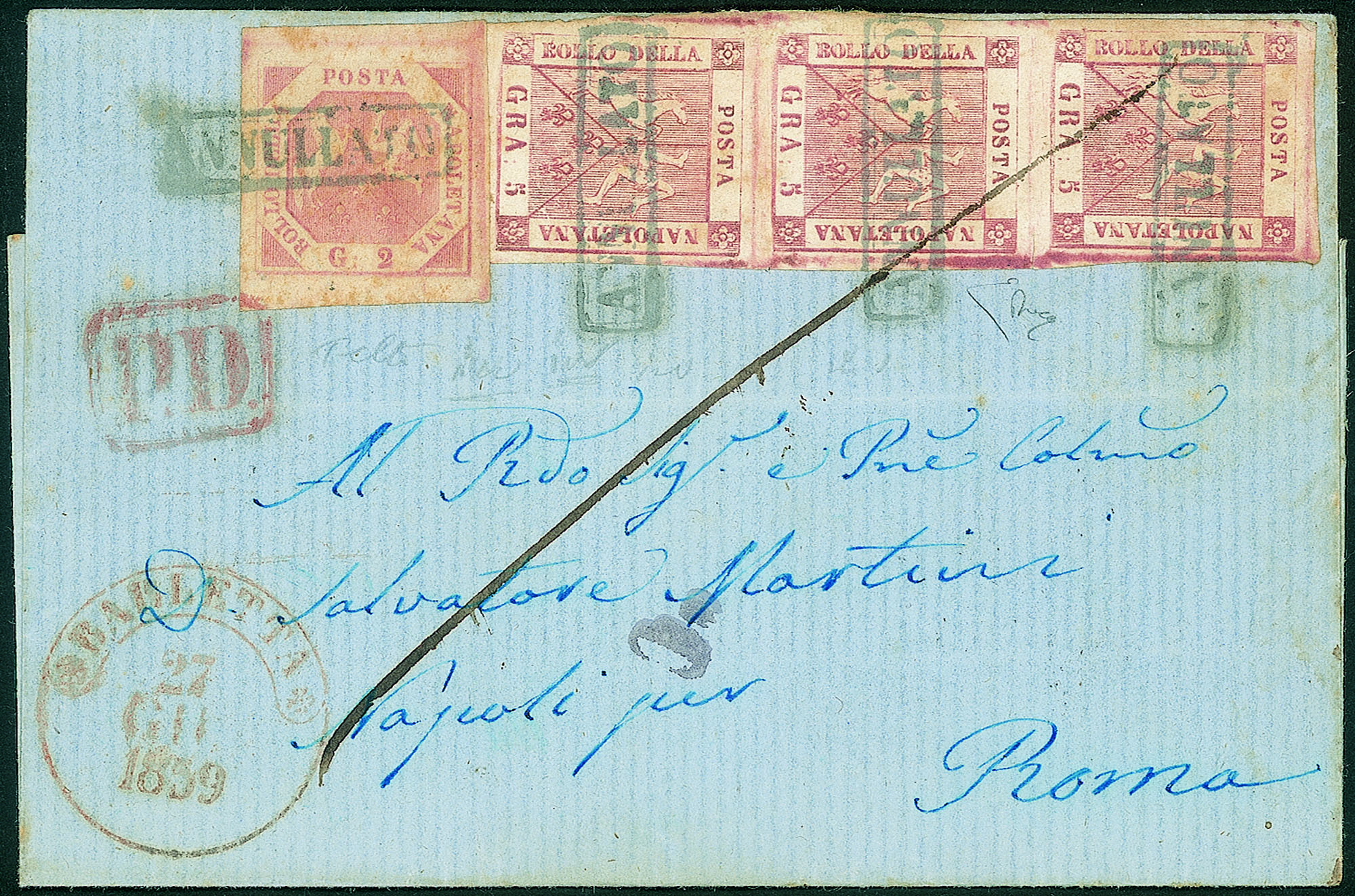 Antichi Stati Italiani - Napoli - Lettera con striscia di tre del 5 grana + esemplare 2 grana (8+7)