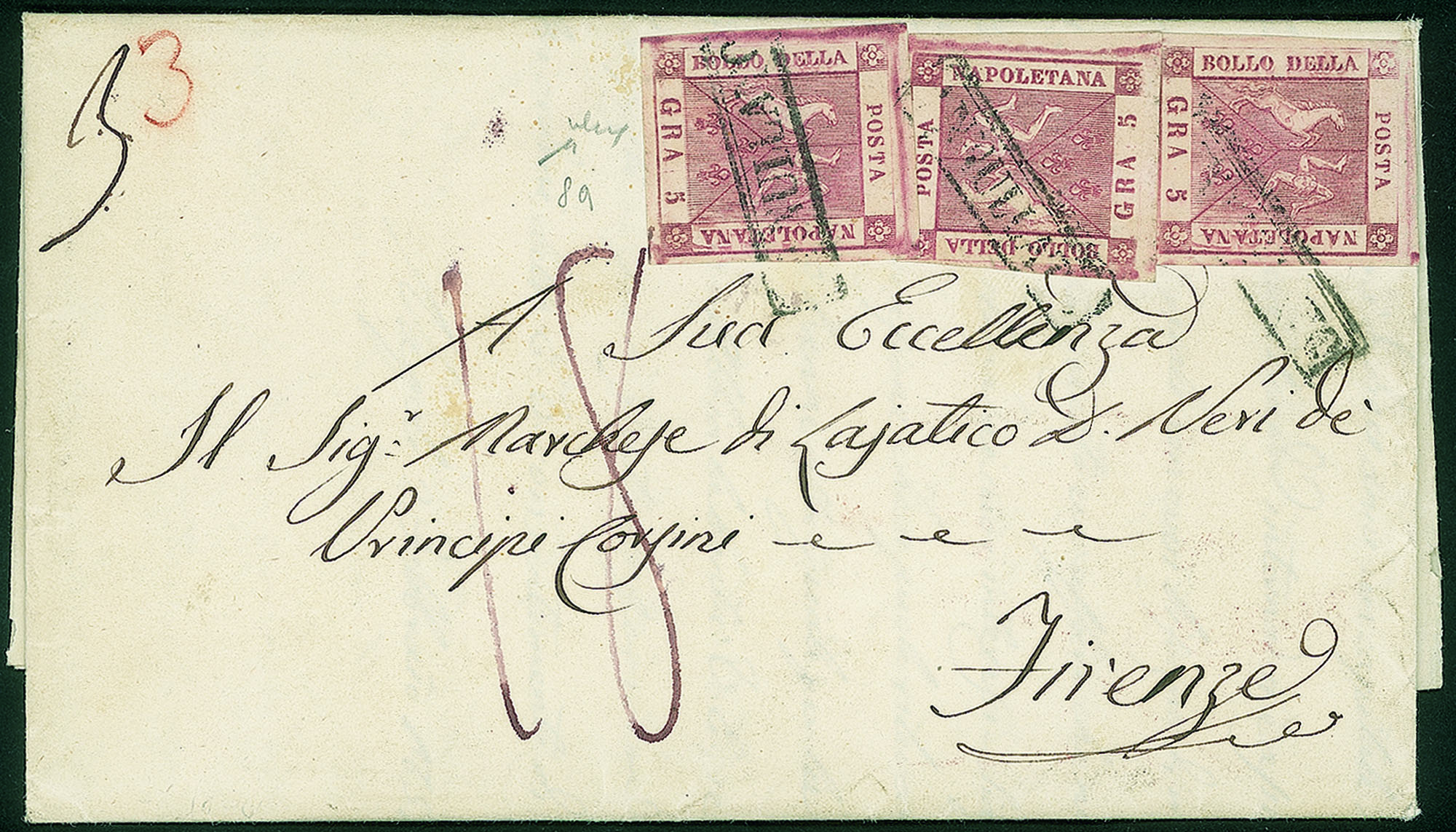 Antichi Stati Italiani - Napoli - Lettera affrancata con tre esemplari del 5 grana rosa brunastro (8a cat.8750)