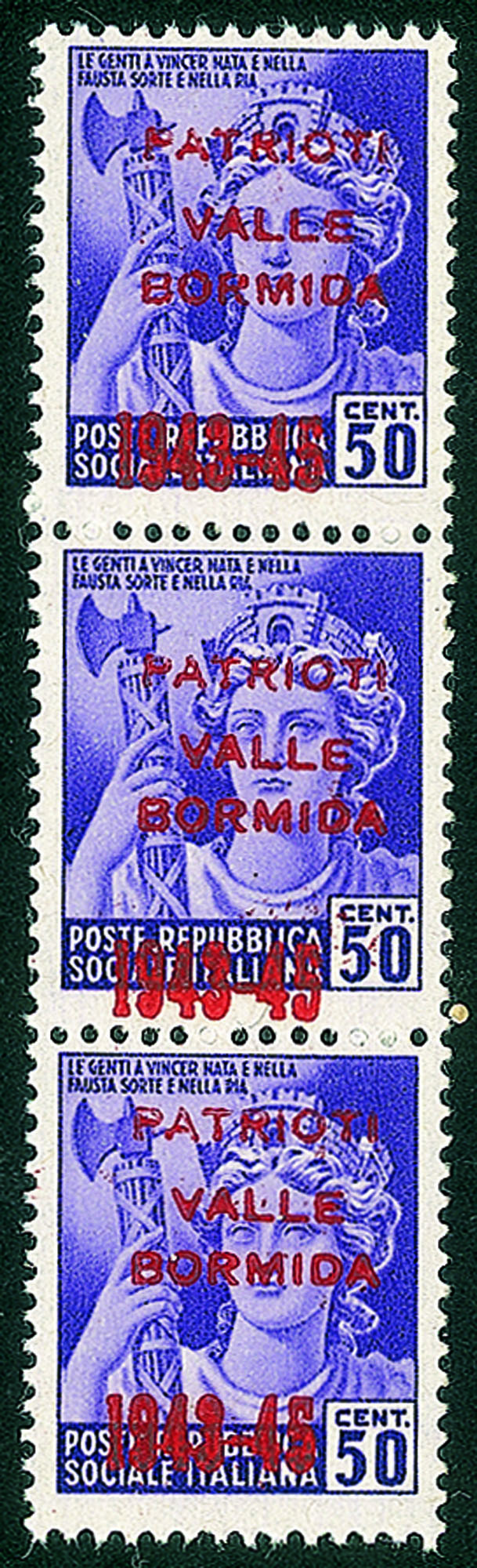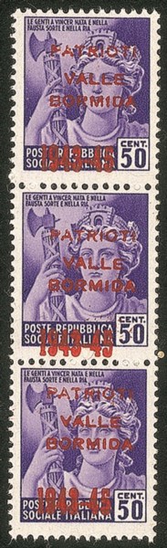 Emissioni CLN - 1945 - 50 cent (5A) - striscia verticale di tre con soprastampe diversamente spaziate (in verticale)
