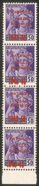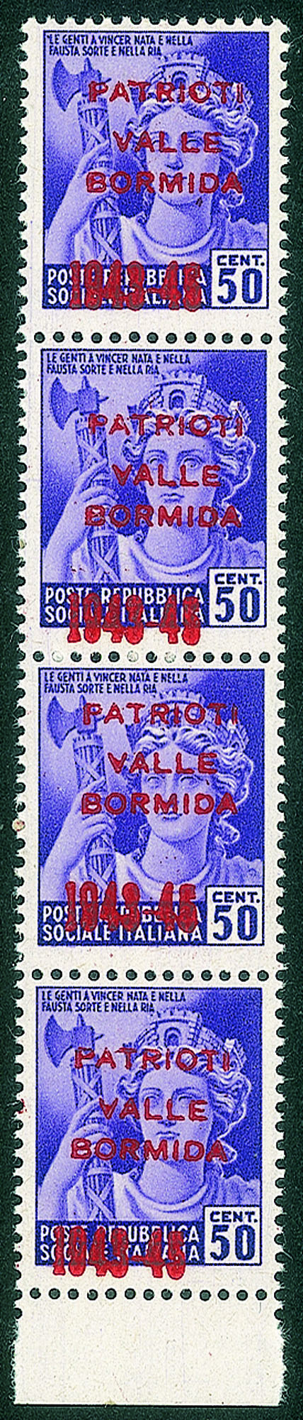 Emissioni CLN - 1945 - 50 cent (5A) - striscia verticale di quattro con spaziature diverse delle soprastampe in verticale