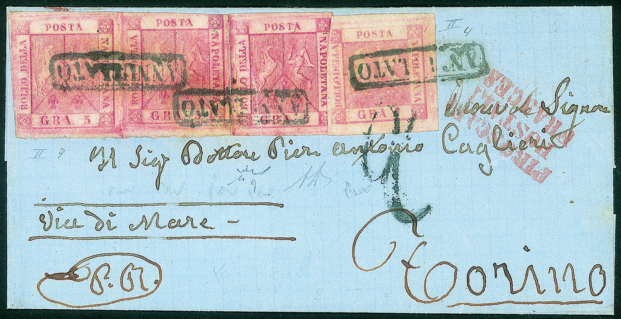 Antichi Stati Italiani - Napoli - Letterina affrancata con coppia + singolo del 5 grana rosa II tavola + 1 grano rosa carminio II tavola (4 + 9 cat.8725)