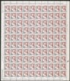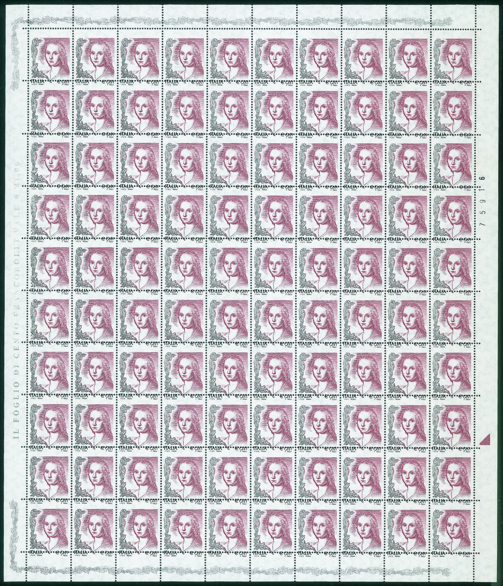 Dentellatura orizzontale spostata in alto (sopra Italia e valore) - intero foglio di 100 con dieci pezzi senza valore e dieci con valore ripetuto a margine - gomma integra
