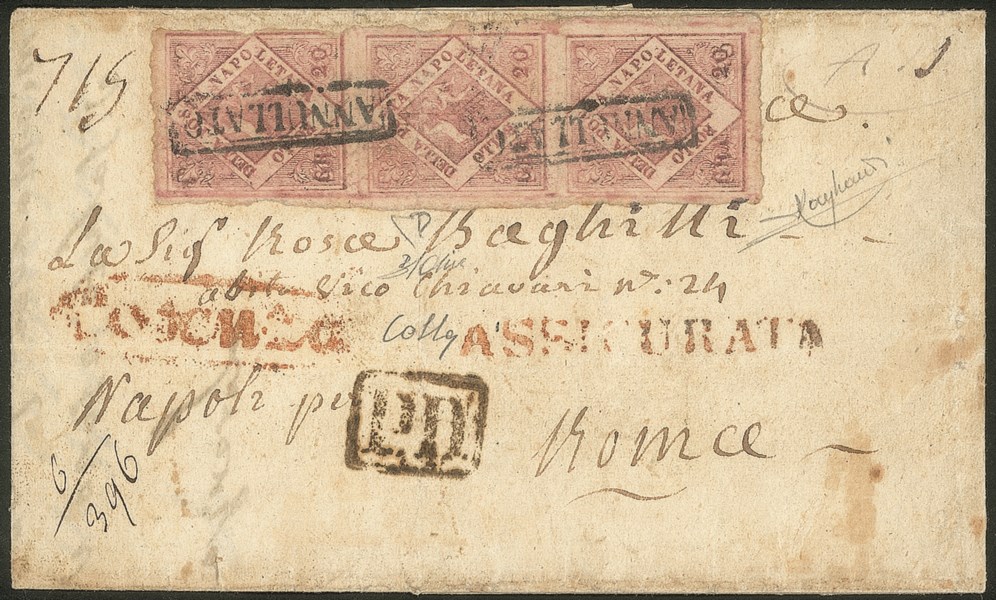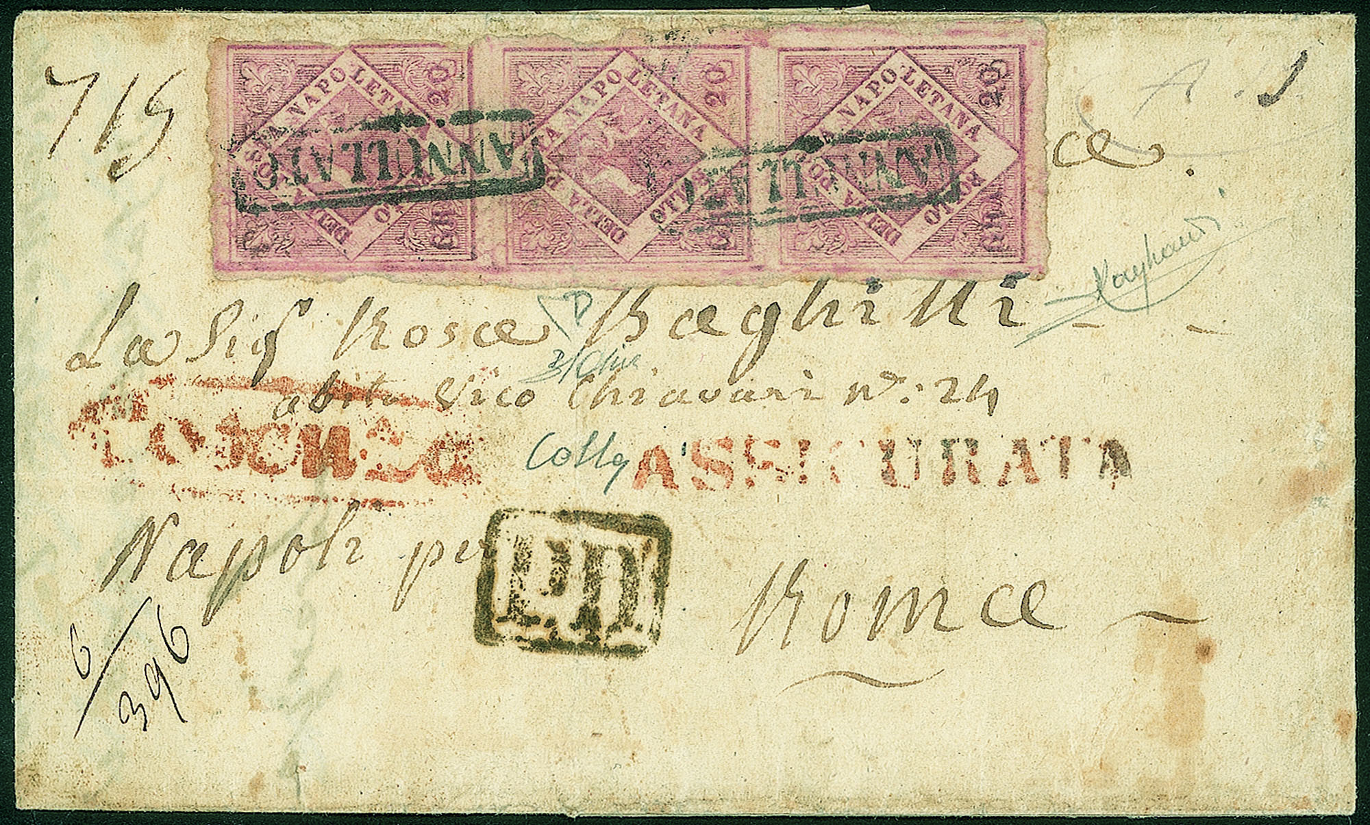 Antichi Stati Italiani - Napoli - Rara lettera affrancata con striscia verticale di tre del gr.20 rosa lillaceo