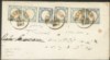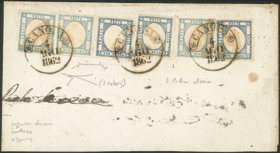 Tre in gradazione celeste uno azzurro due indaco chiaro (20a+20b+20e) - lievi difetti di marginatura in alcuni francobolli - su testata di grande involucro di plico da Canosa 4 AGO.1862 - eccezionale - cert. Bottacchi
