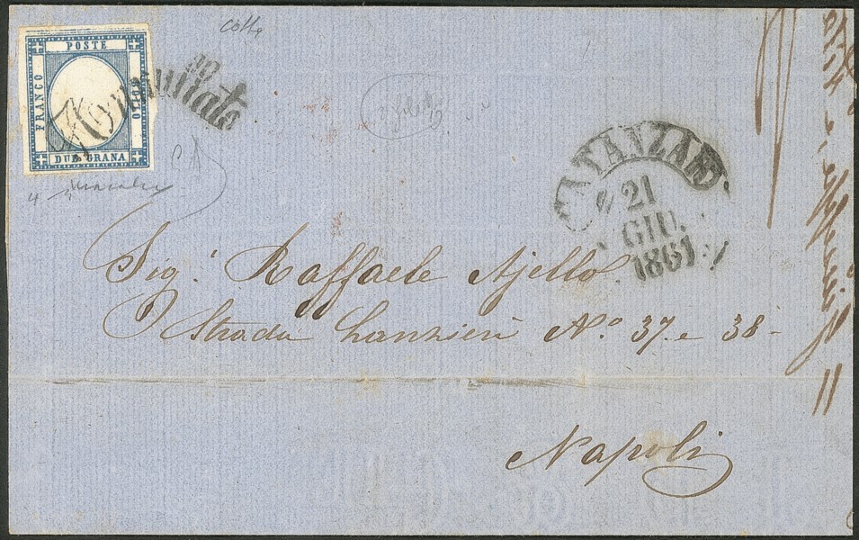 Con doppio filetto di inquadratura in alto completo (20ka cat.4500+) annullato con svolazzo da Catanzaro 21 GIU.1861 per Napoli - firma Chiavarello