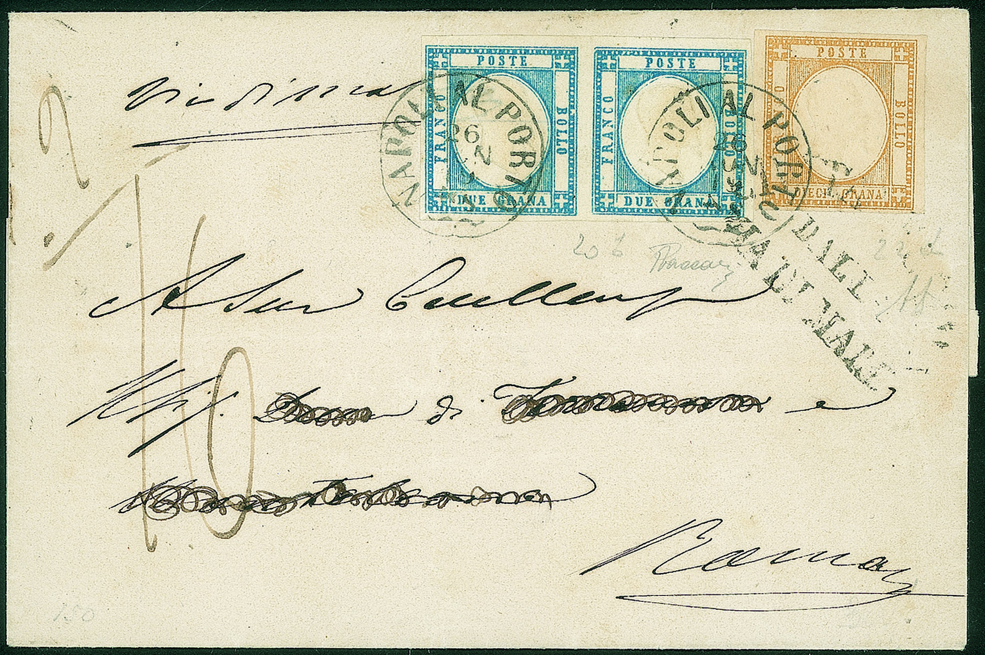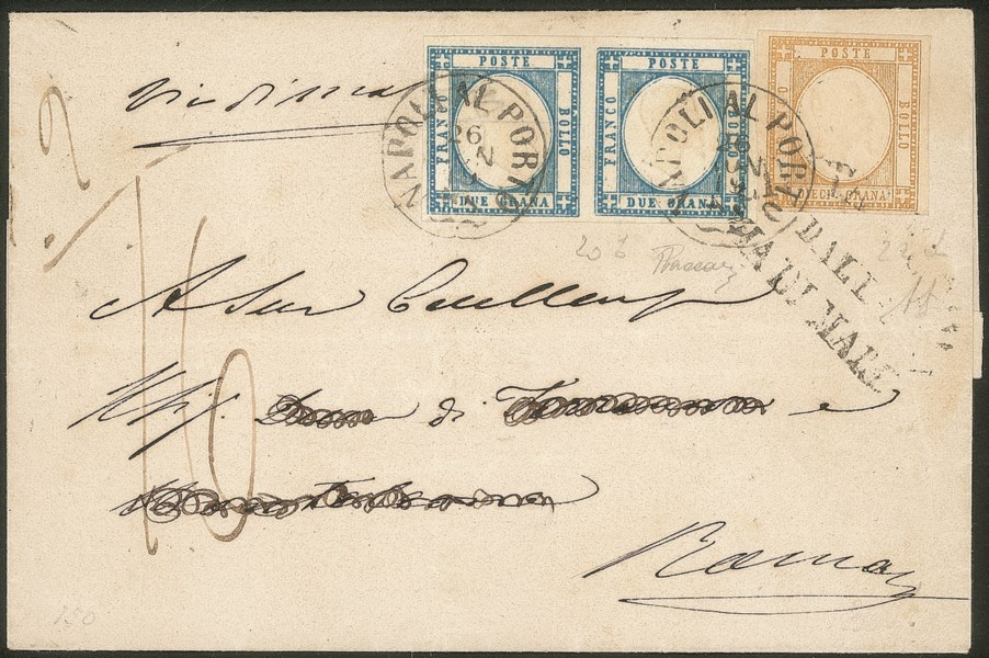 Su sovracoperta di lettera da Napoli 26.11.1861 a Roma - bollo via di mare di Civitavecchia coannullatore - tassata 16 bajocchi - molto fresca e di ottimo aspetto - Firma A.Diena