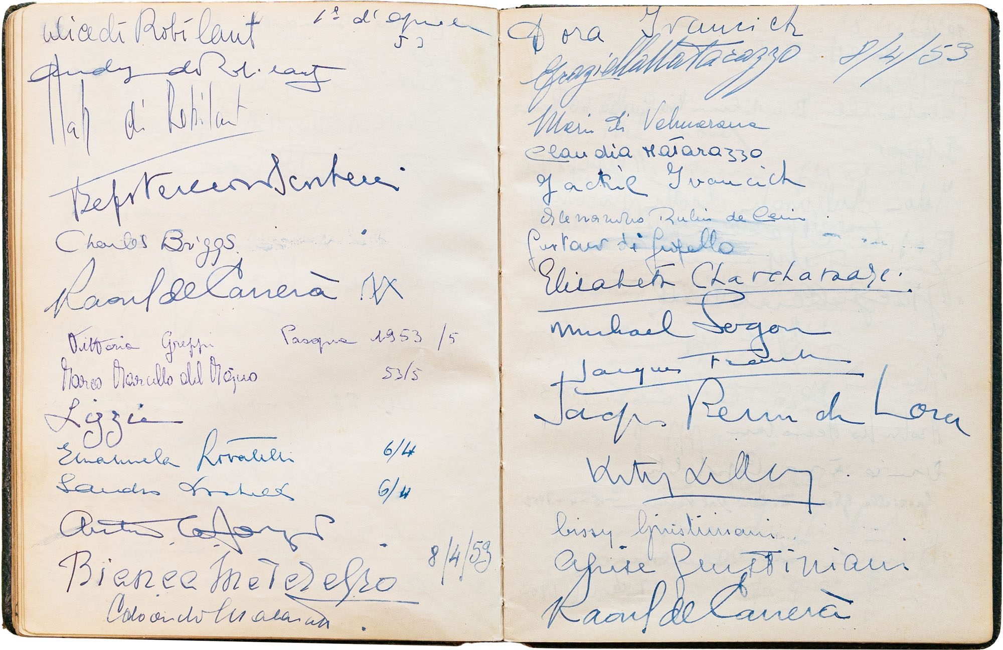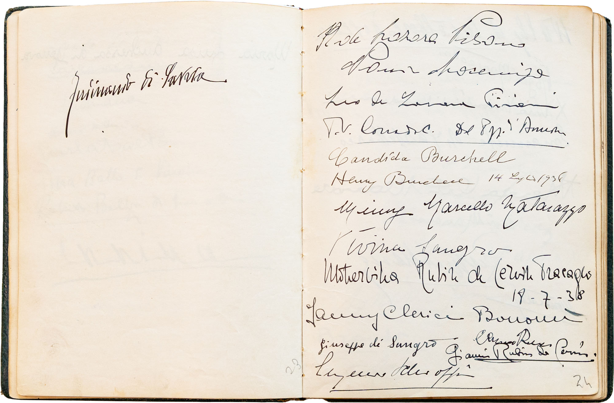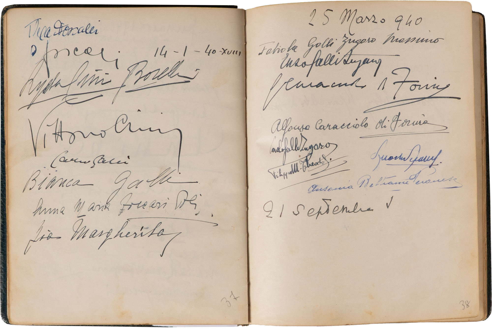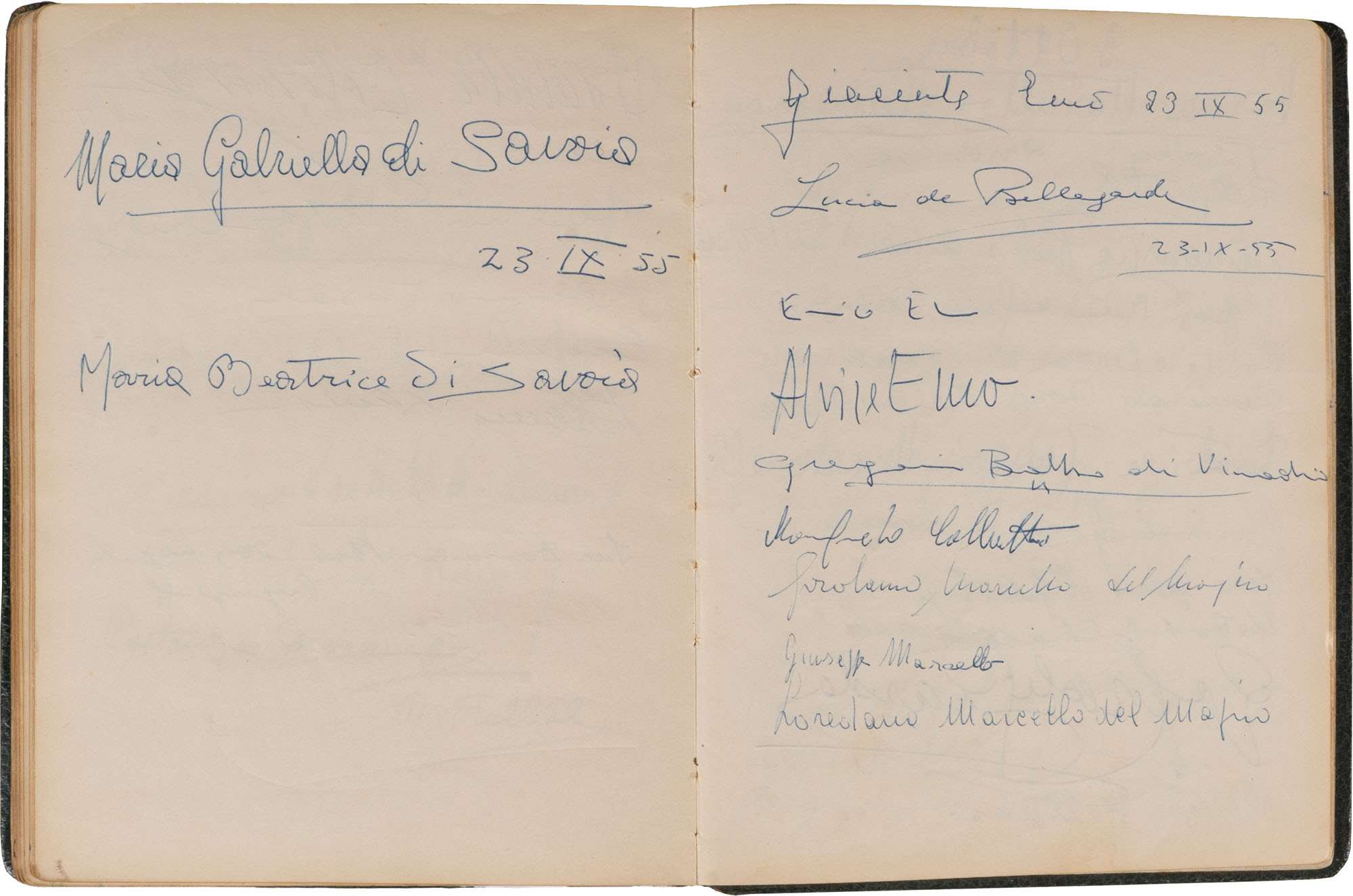 Il libro firma appartenne ad una ricca e importante famiglia veneta, che era solita raccogliere le firme autografe delle personalità che venivano invitate a feste e ricevimenti. Il periodo in cui il libro fu utilizzato va dall'ottobre del 1934 fino all'ottobre del 1955 e tra i più di 2000 autografi originali ne troviamo alcuni di personaggi importanti sia Italia che in tutto il mondo: si va da appartenenti al casato di Savoia, Edoardo VIII d'Inghilterra e sua moglie Wallis Simpson, i figli dello Shah di Persia Reza Pahlavi, Pietro II re di Jugoslavia, nobili di diversi paesi europei, politici e artisti.