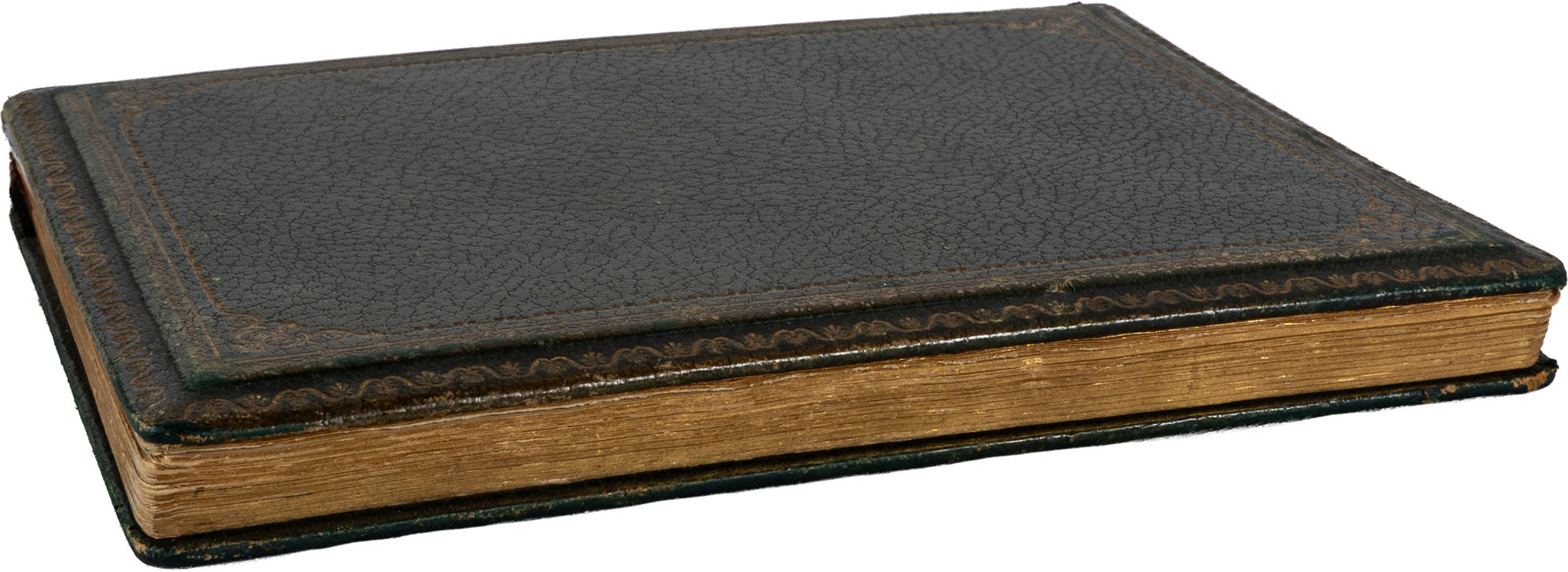 Legatura in piena pelle con tre ricche cornici in oro impresse al piatto anteriore, fregi oro al dorso, decorazione impressa al piatto posteriore, tagli dorati
