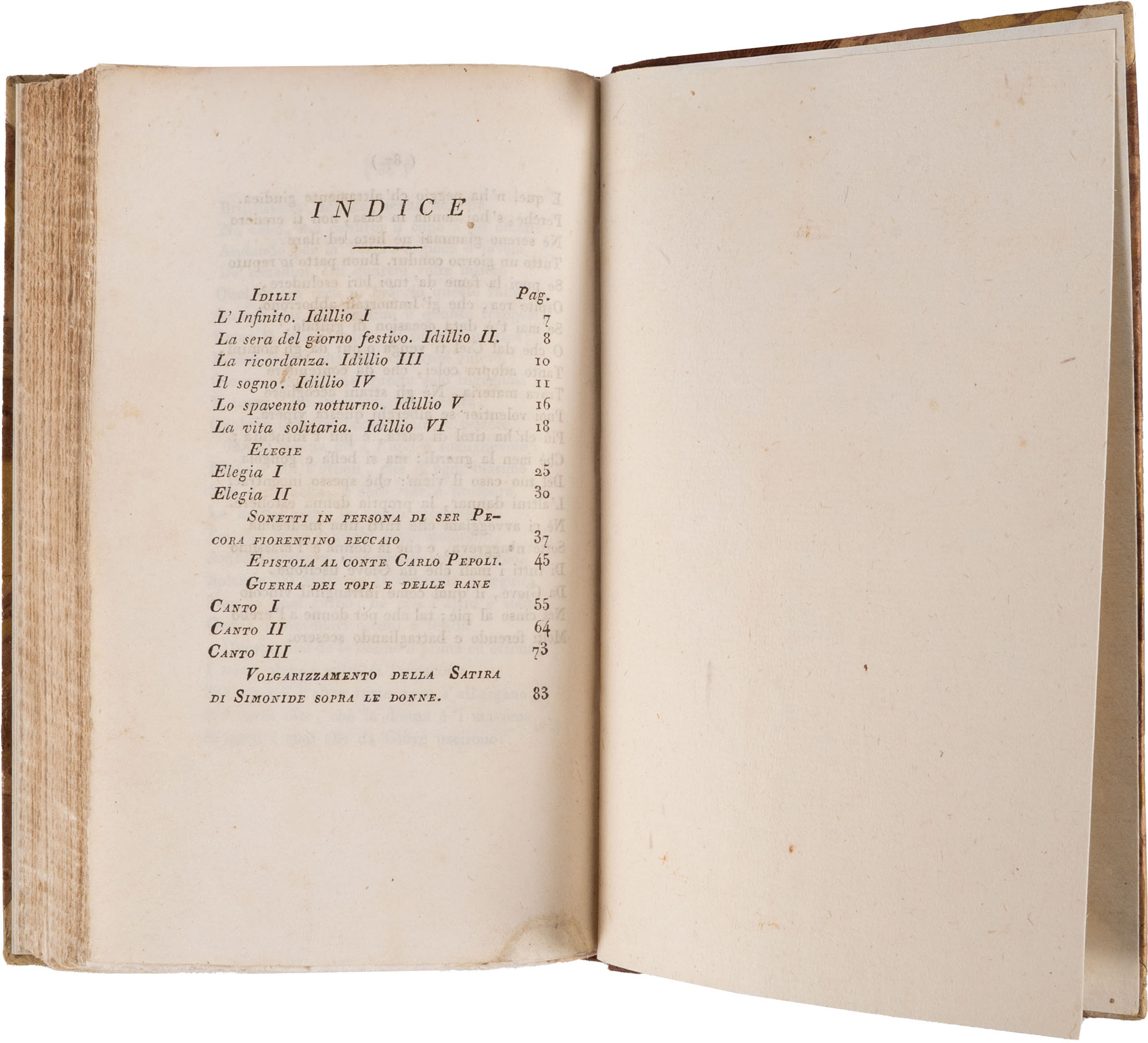Unitamente al primo titolo è qui rilegata, sempre in prima edizione, la seconda raccolta poetica di Giacomo Leopardi, che vide la luce ai primi del 1827, ma con data del 1826