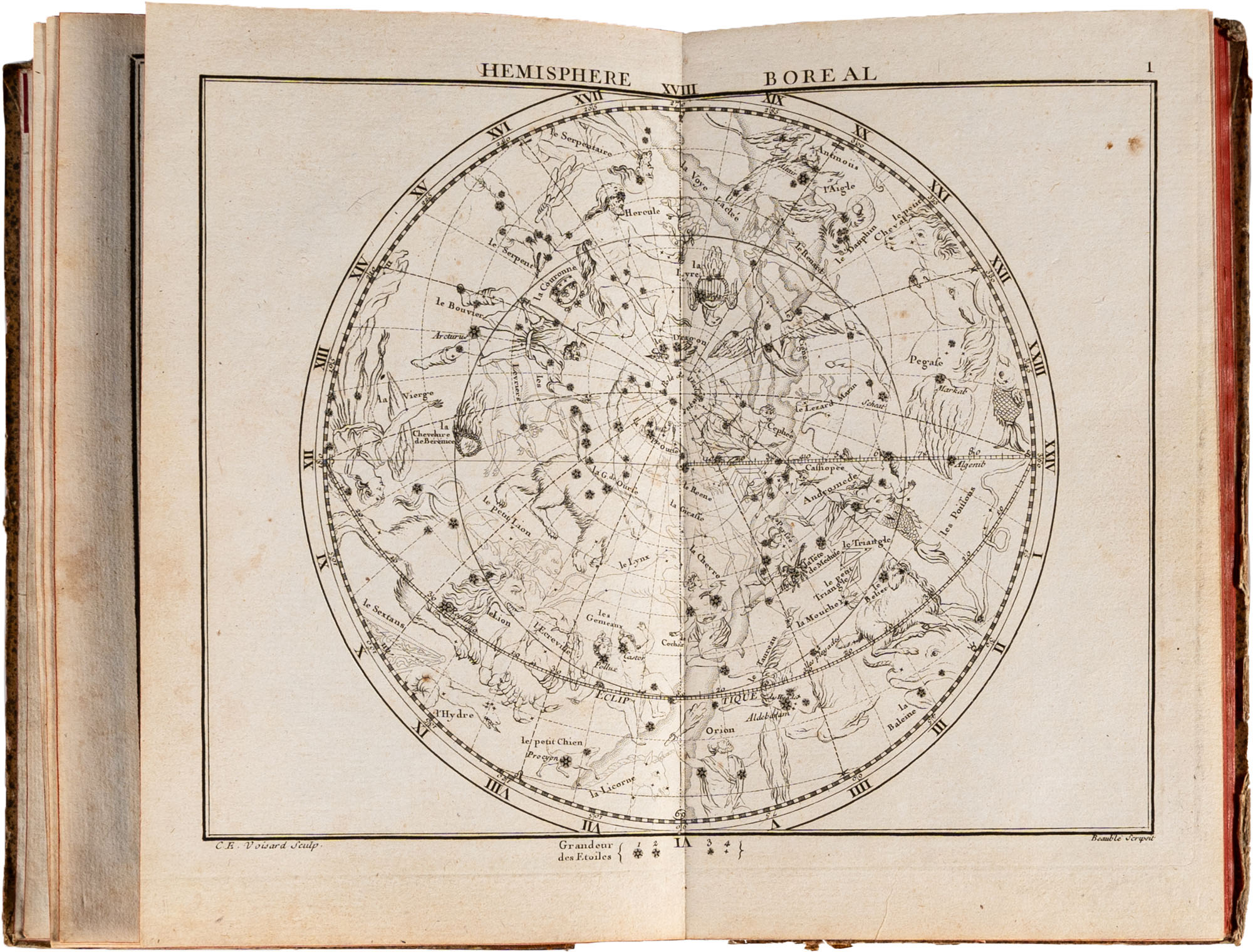 Celebre atlante celeste per opera di John Flamsteed, astronomo della casa Reale d'Inghilterra e fondatore della specola di Greenwich, nella versione del francese Fortin. Le tavole, ci mostrano le varie costellazioni con le immagini mitologiche, queste sono 26, le altre con Emisfero Boreale, 2 con l'Emisfero Australe, 1 col Planisfero
