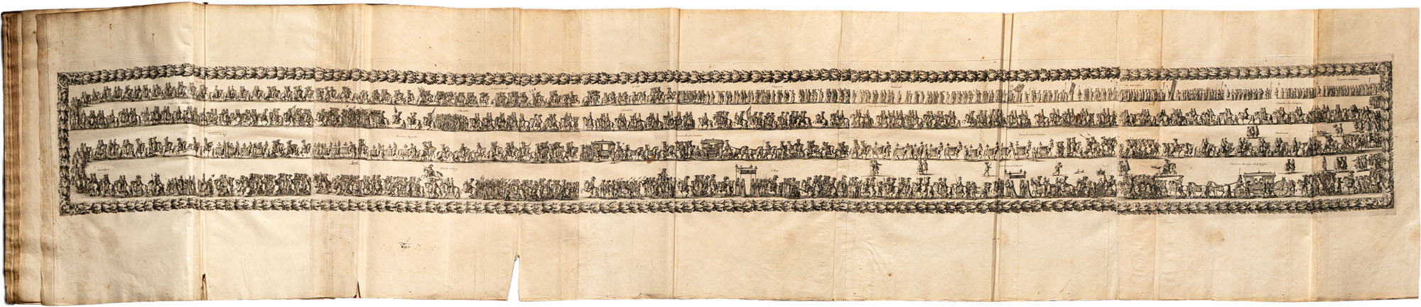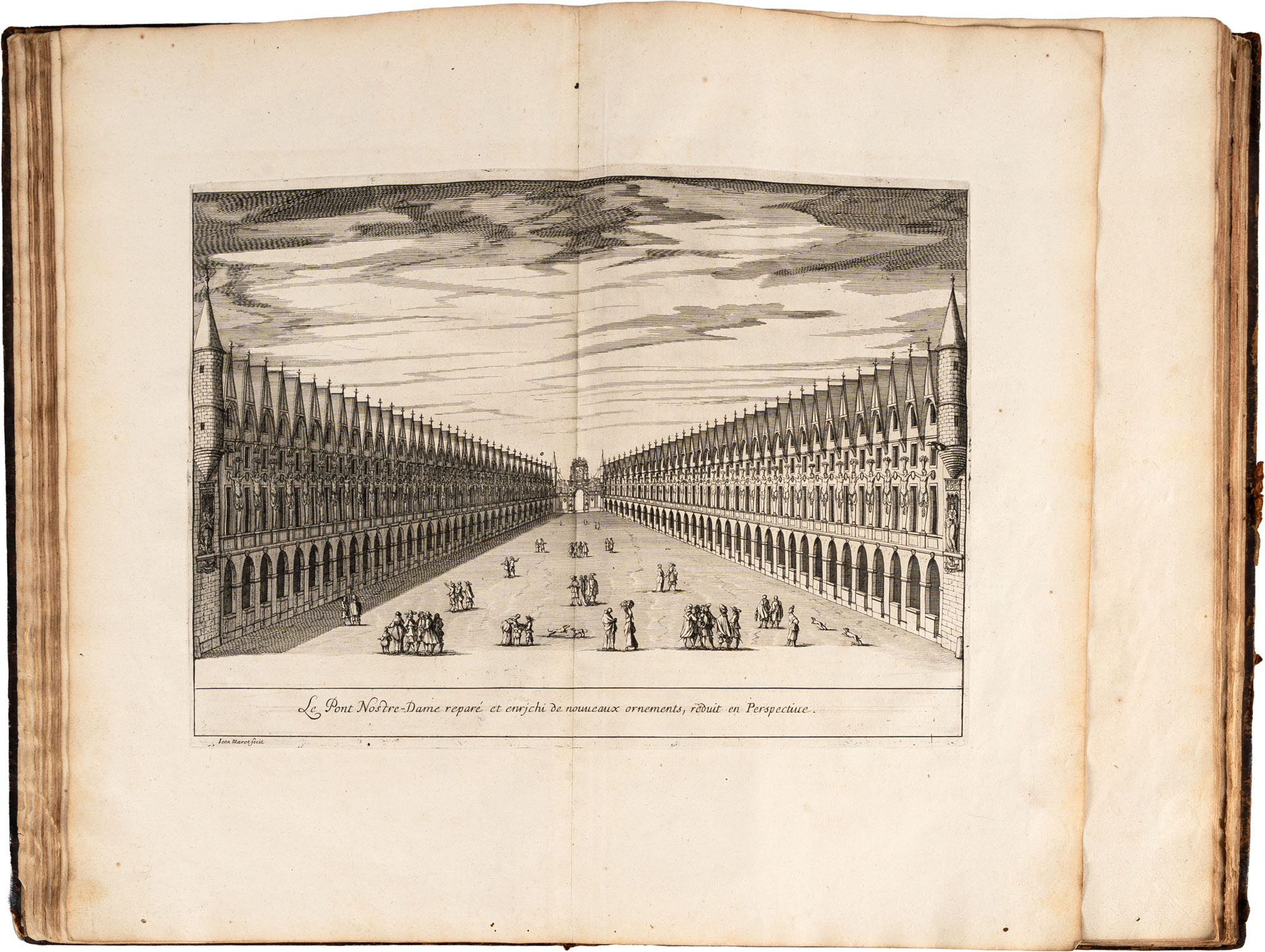 1 frontispizio inciso a piena pagina, 1 titolo, 1 ritratto del re Louis XIV, 1 di dedica, (4) ff. di avvertenze al lettore e prefazione + 7 pp., 34 pp., 28 pp., 12 pp., 14 tavole su doppia pagina e 8 à piena pagina incise da J. Marot et Chauveau, da disegni di J. Le Pautre (1 tavola è lunga 200 centimetri)