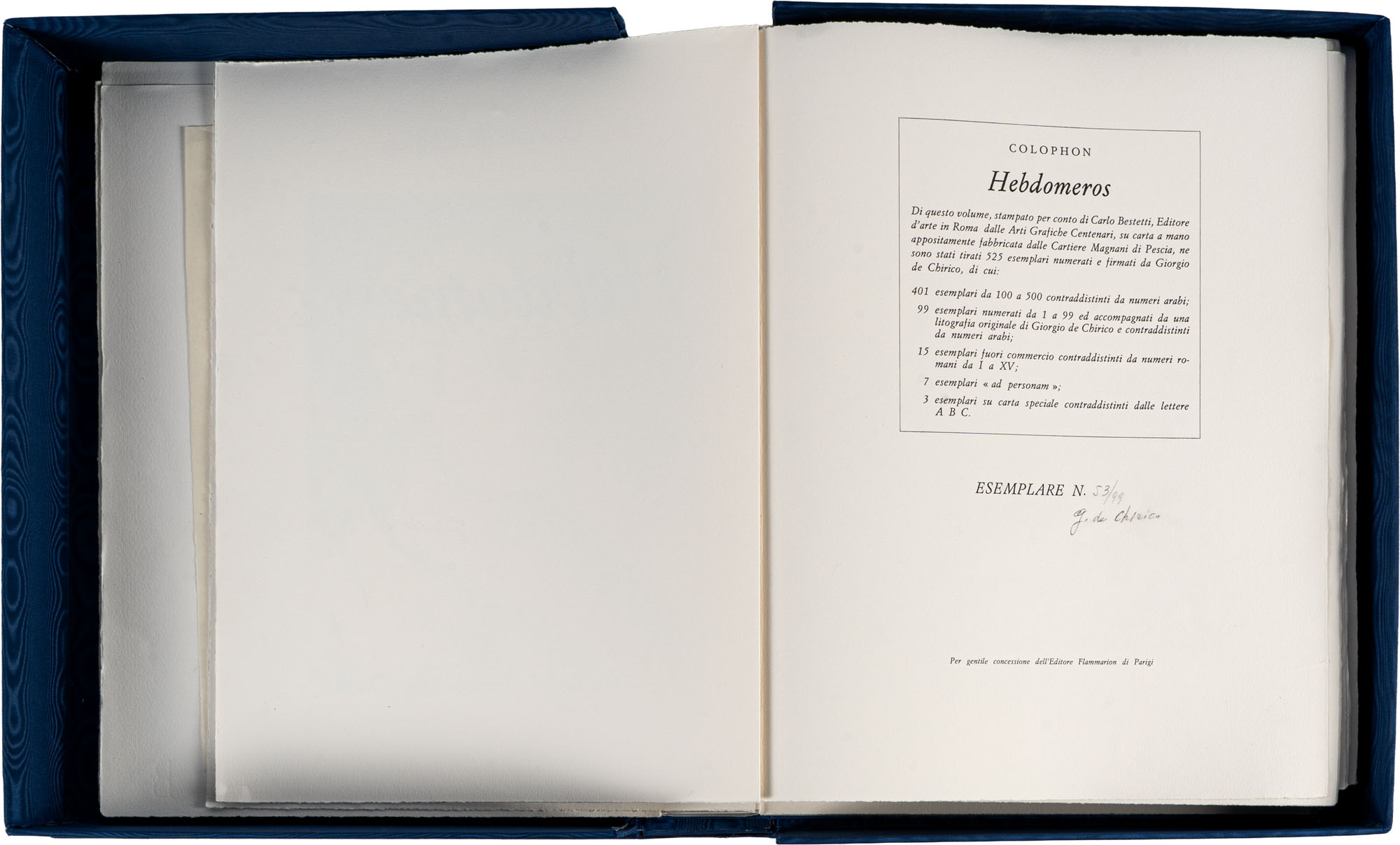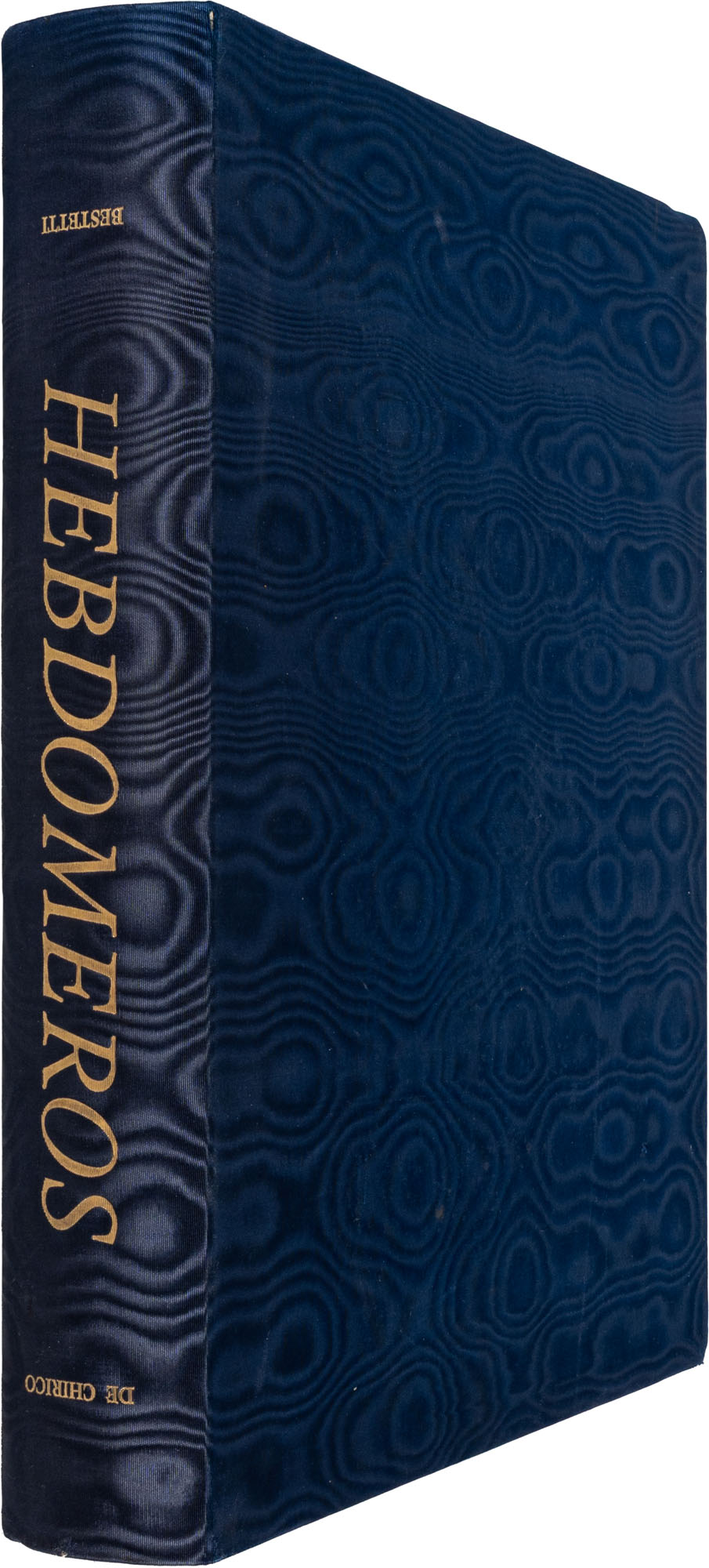 Esemplari sciolti, con copertina originale in cartonato che riproduce al piatto anteriore una litografia di De Chirico, e in custodia rigida in seta blu con titolo in oro al dorso