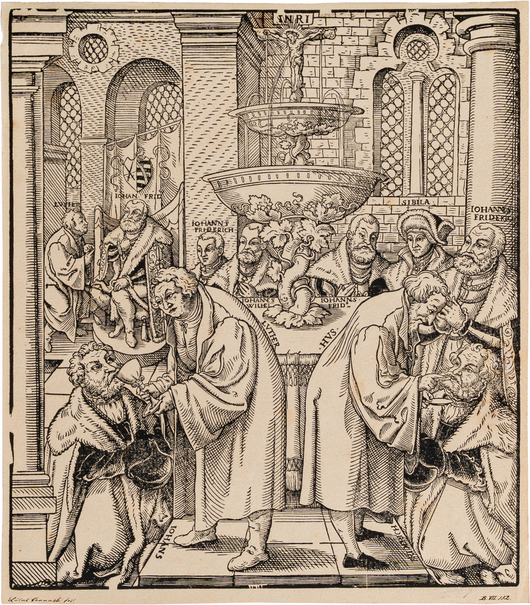 Lucas Cranach il Vecchio (Kronach, 1472 - Weimar, 1553) - I riformatori Lutero e Hus che danno la comunione ai principi della casa di Sassonia
