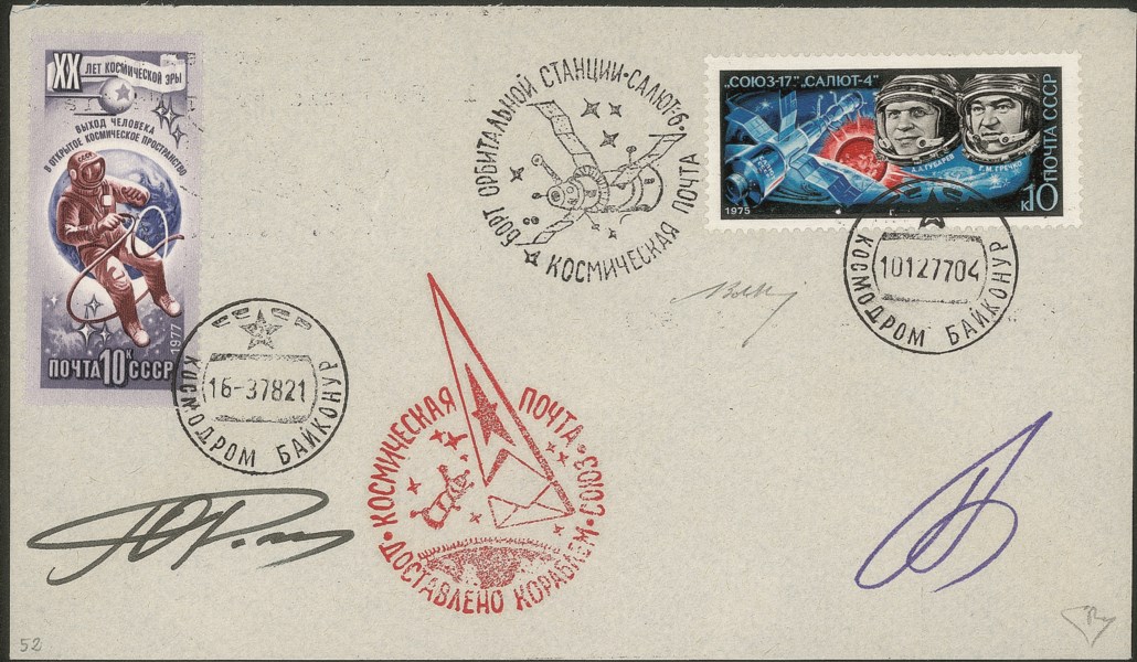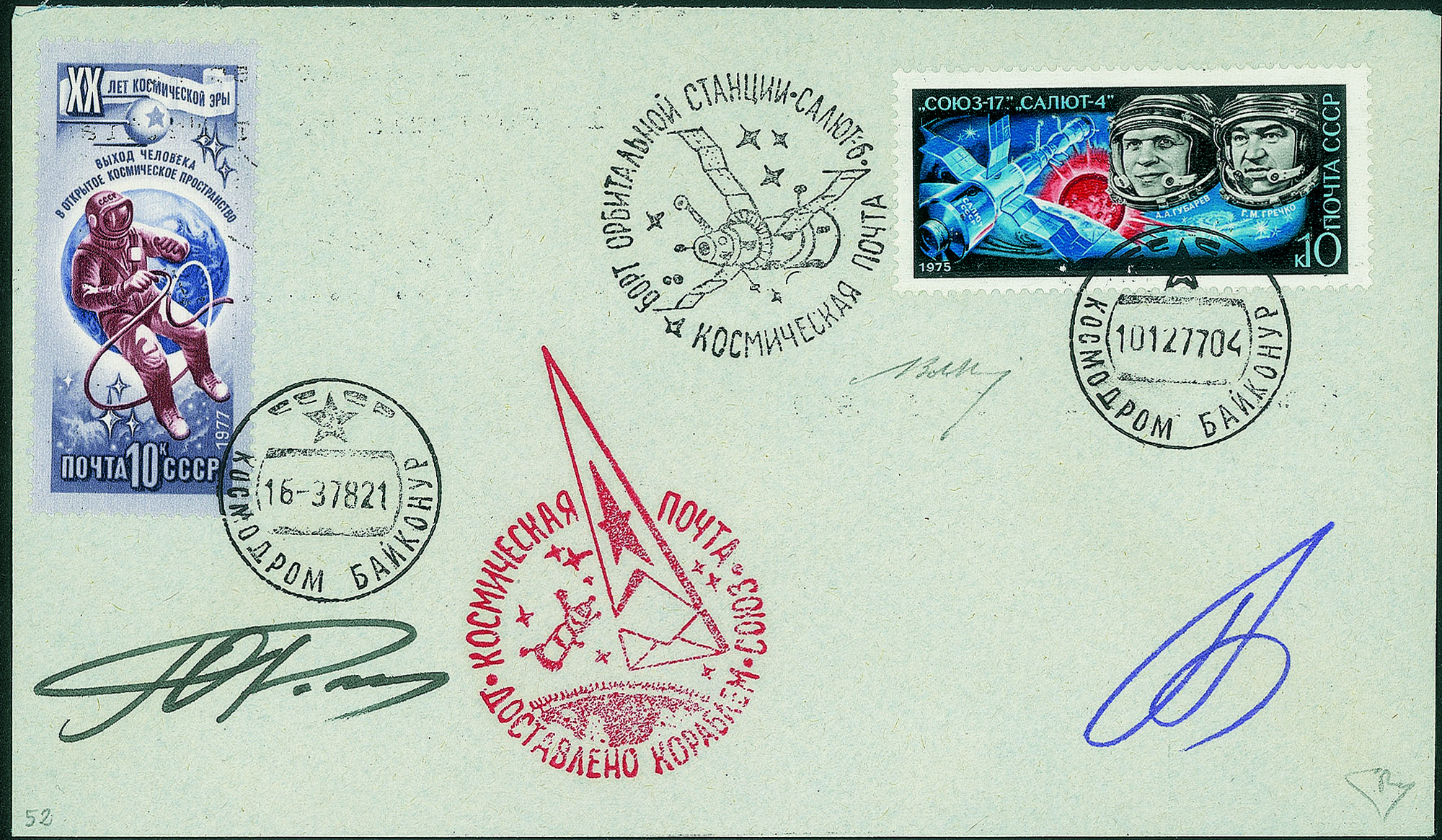 Cosmogramma del volo Soyuz 26 a bordo della Salyut-6 con firme autografe del comandante Y.Romanenko e e del tecnico di bordo G.Gretschko - annullo a data CC*CP 10.12.77 e CC*CP 16.3.78 apposti dall'ufficio postale del Cosmodromo di Baikonur (giorno di lancio della Soyuz 26 e di atterraggio con la Soyuz 27 dopo 96 giorni di permanenza sulla Salyut-6) - bollo nero A bordo della stazione spaziale Salyut-6 Posta cosmica e rosso Posta cosmica - trasportato con la nave spaziale Soyuz - la Soyuz 26 raggiunse con successo la stazione spaziale permettendo così l' 11.1.1978, con l'arrivo della Soyuz 27, il primo aggancio di tre veicoli nel cosmo e la prima visita dell'equipaggio residente da parte di un equipaggio ospite (V.Dzhanibekov e O.Makarov - Soyuz 27) - ottima qualità - cert E.Diena + cert. Finanziario Bolaffi 100%