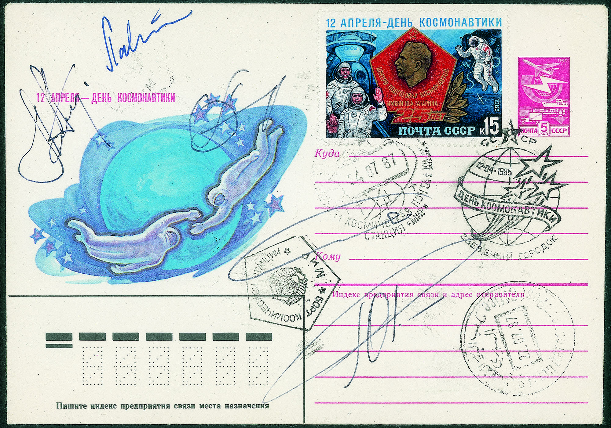 Cosmogramma del volo sovietico-siriano Soyuz TM-3 - bollo pentagonale nero di bordo Mir, annullo ufficiale Siria 22.07.87, lancio, e sovietico-siriano CC*CP 24.07.87, commemorativo dell'aggancio Mir e del carattere internazionale del volo sovietico-siriano - firme autografe di Y.Romanenko e A.Laveikin (Soyuz TM-2 a bordo della stazione), A.Viktorenko, A.Alexandrov e M.Faris, Siria (Soyuz TM-3) - ottima qualità - cert. Kniga