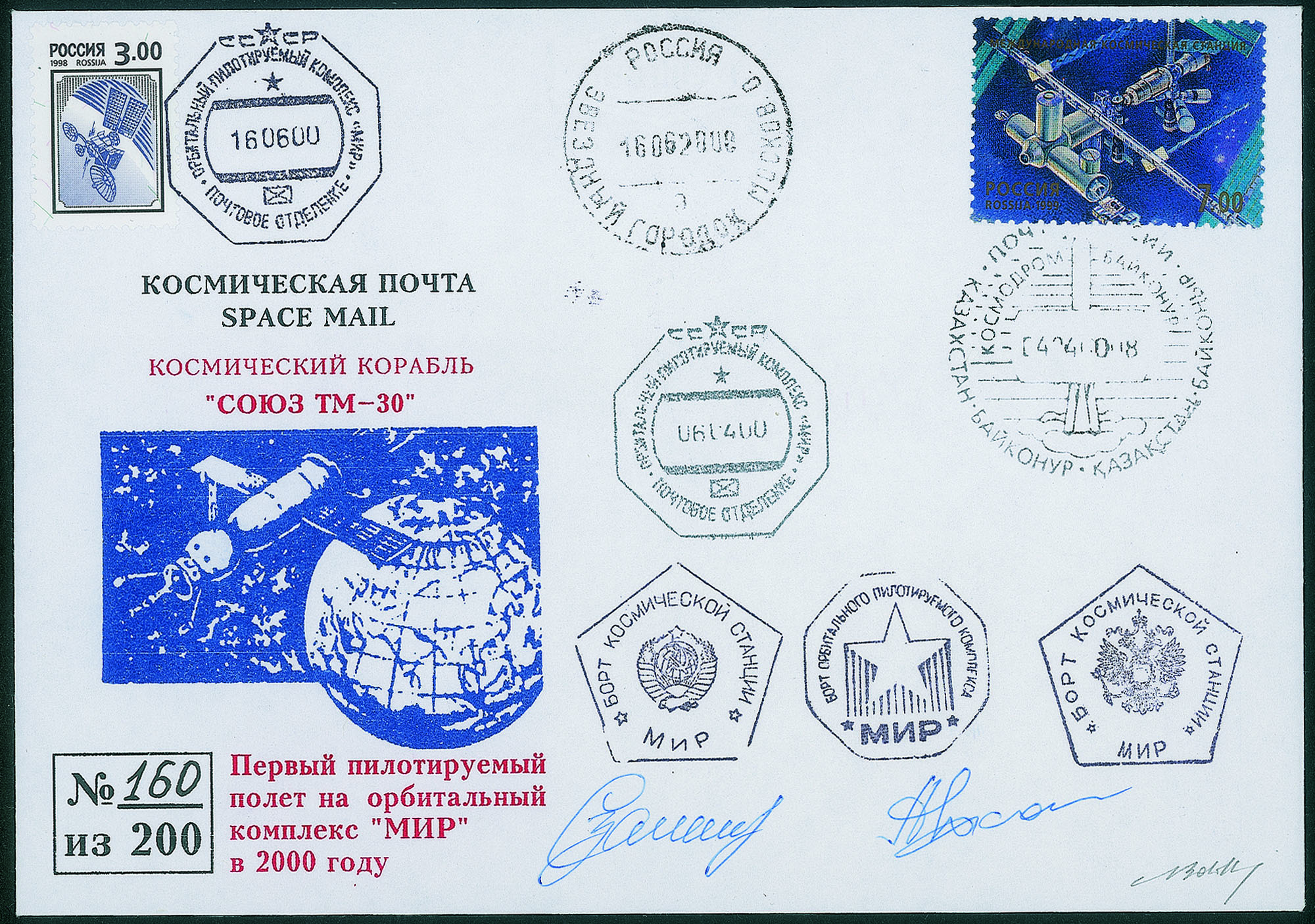 Busta n.160 di 200 trasportata a bordo Mir dalla Soyuz TM- 30 - ann. di partenza dal Cosmodromo di Baikonur del 4.4.2000; ann. ottagonale CC*CP 06.04.00, aggancio Soyuz TM-30/Mir; timbri di bordo neri, entrambi i bolli pentagonali e l'ottagonale stellare - al verso foglietto con citazione del pioniere russo Tsiolkovsky + annullo ottagonale stellare di bordo Mir - firme autografe dei cosmonauti Zaletin e Kalery - cert di autenticità del comandante Zaletin + cert. Finanziario Bolaffi 100%