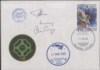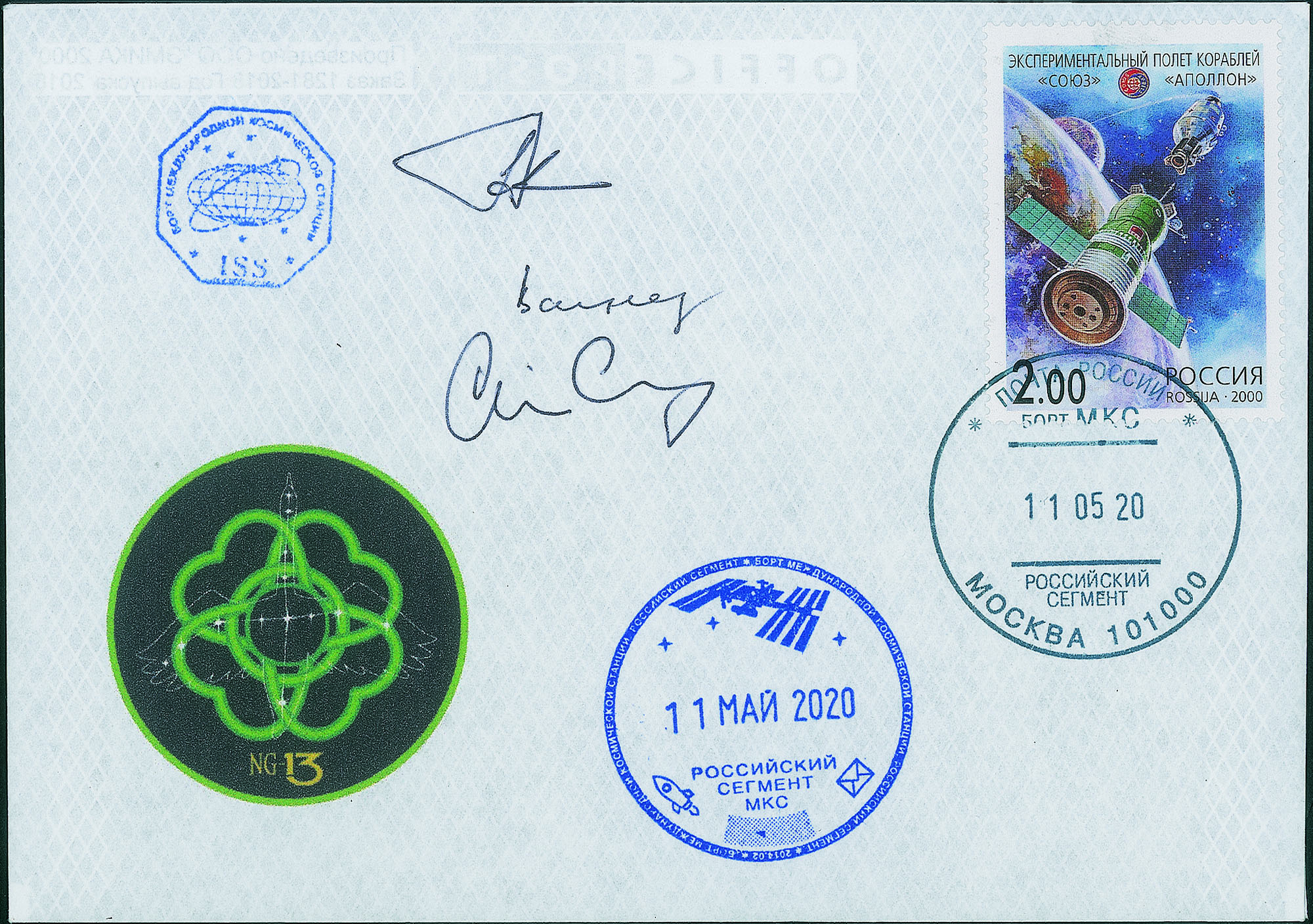 Cosmogramma timbrato con gli annulli di bordo datati 11.05.2020, giorno del distacco della navicella di rifornimento senza equipaggio americana Cygnus NG-13 dalla ISS - firme autografe dei 3 astronauti (Soyuz MS-16) a bordo della ISS l'H.05.2020: C.Cassidy (USA); A.lvanishin e I.Vagner (Russia) - ottima qualità